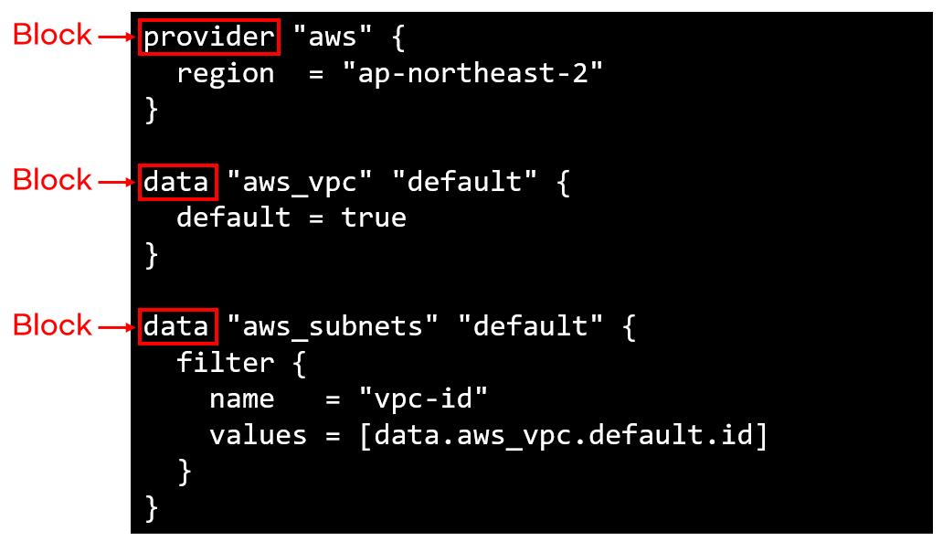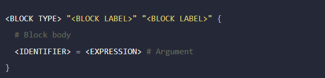 테라폼 코드는 HCL라는 언어로 작성합니다. HCL은 Block이라는 기본단위를 사용합니다. 테라폼 코드는 Block단위의 집합입니다.
