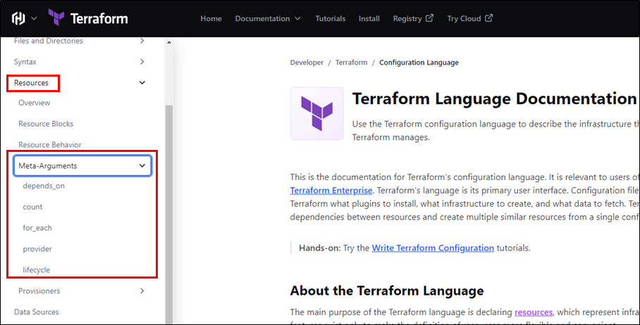 Argument 중에 특수한 기능을 담당하는 Argument는 Meta-Argument라고 부릅니다. Meta-arguments는 공식문서(https://developer.hashicorp.com/terraform/language)에서 찾을 수 있습니다.