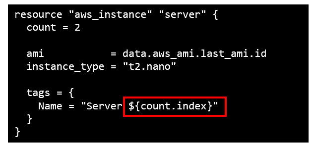 count.index를 사용하면 index(반복횟수)에 접근할 수 있습니다. 예제에서는 tag.name을 설정할 때 index를 사용했습니다.