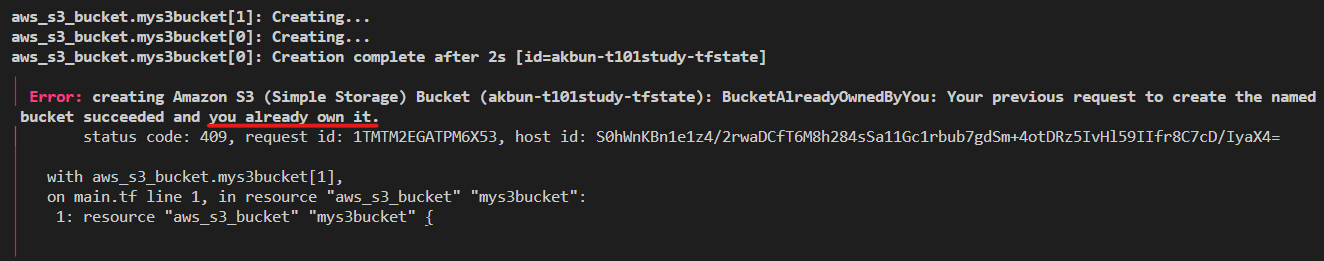 terraform apply 명령어를 실행하면 2번째 bucket생성 할 때, bucket 생성 오류가 발생합니다.