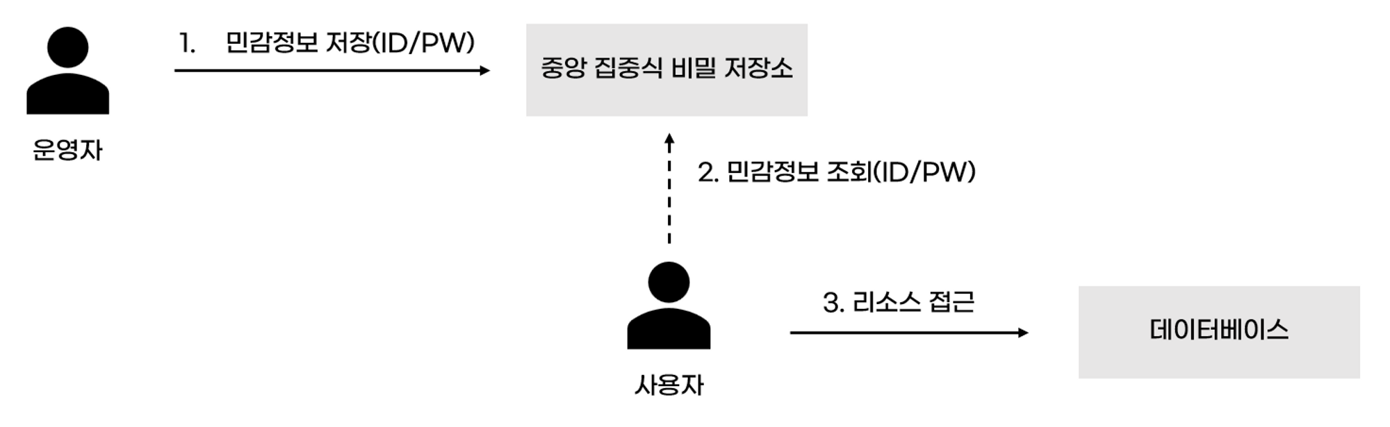 중앙 집중식 비밀 저장소는 민감정보를 안전하게 저장하는 저장소입니다. 운영자가 민감정보를 저장소에 저장하면 사용자는 저장소에 접근하여 민감정보를 조회합니다.