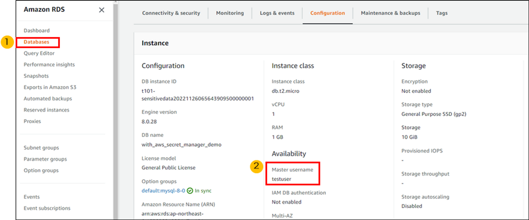 aws RDS 대시보드에서 RDS가 생성되었는지 확인합니다. 그리고 RDS 속성에서 username이 aws secret manager의 username과 같은지 확인합니다.