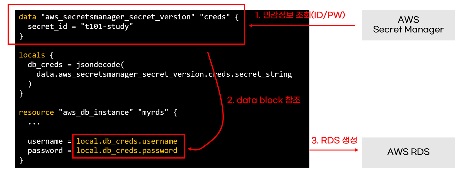 테라폼 코드에 불가피하게 민감정보를 작성해야 하는 경우, 중앙 집중식 비밀 저장소(aws Secret Manager, Valut 등)를 사용하여 민감정보 노출을 최소화 할 수 있습니다.