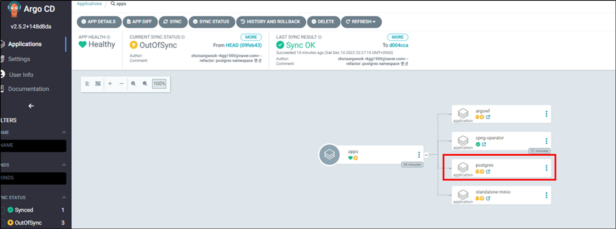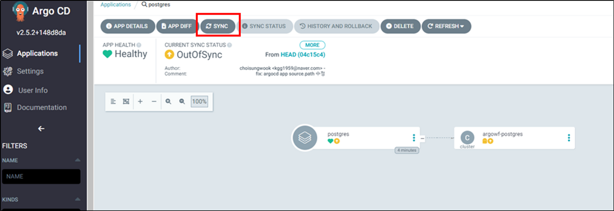 이제 postgres를 설치해봅시다. postgres application를 sync합니다.