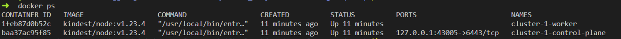 terraform apply명령어가 성공 한 후, 도커 컨테이너 목록을 확인해보세요. control-plane노드 컨테이너와 worker노드 컨테이너가 생성되어 있습니다.