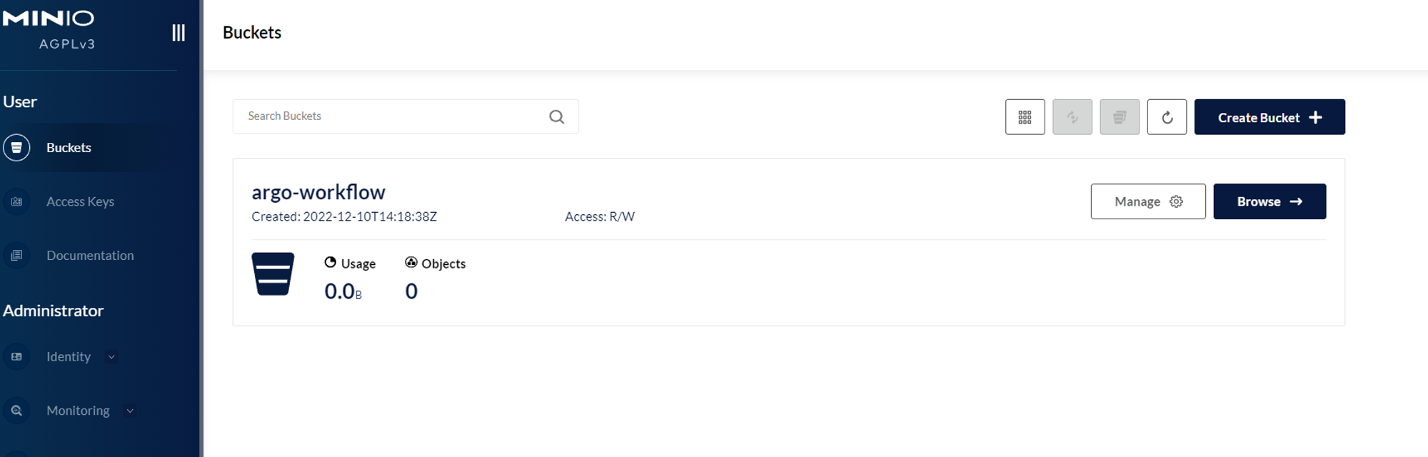 로그인에 성공하면 bucket목록이 보입니다. helm values에 argo-workflow bucket은 helm values에 생성설정이 되어 있기 떄문에 목록에 보입니다.