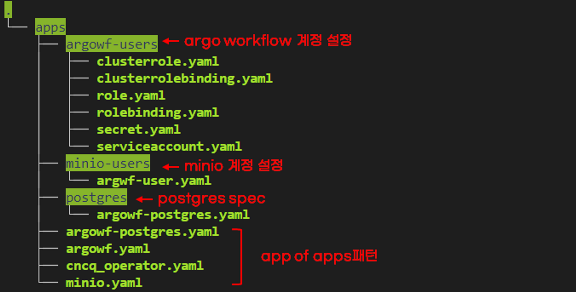 이 글에서는 argo workflow를 배포합니다. argo workflow는 minio, postgresql가 필요합니다. 그러므로 설치할 준비작업이 많이 필요한데 app of apps패턴을 사용하여 그룹으로 관리했습니다. minio는 standalone, postgres는 cnpg operator를 사용했습니다.