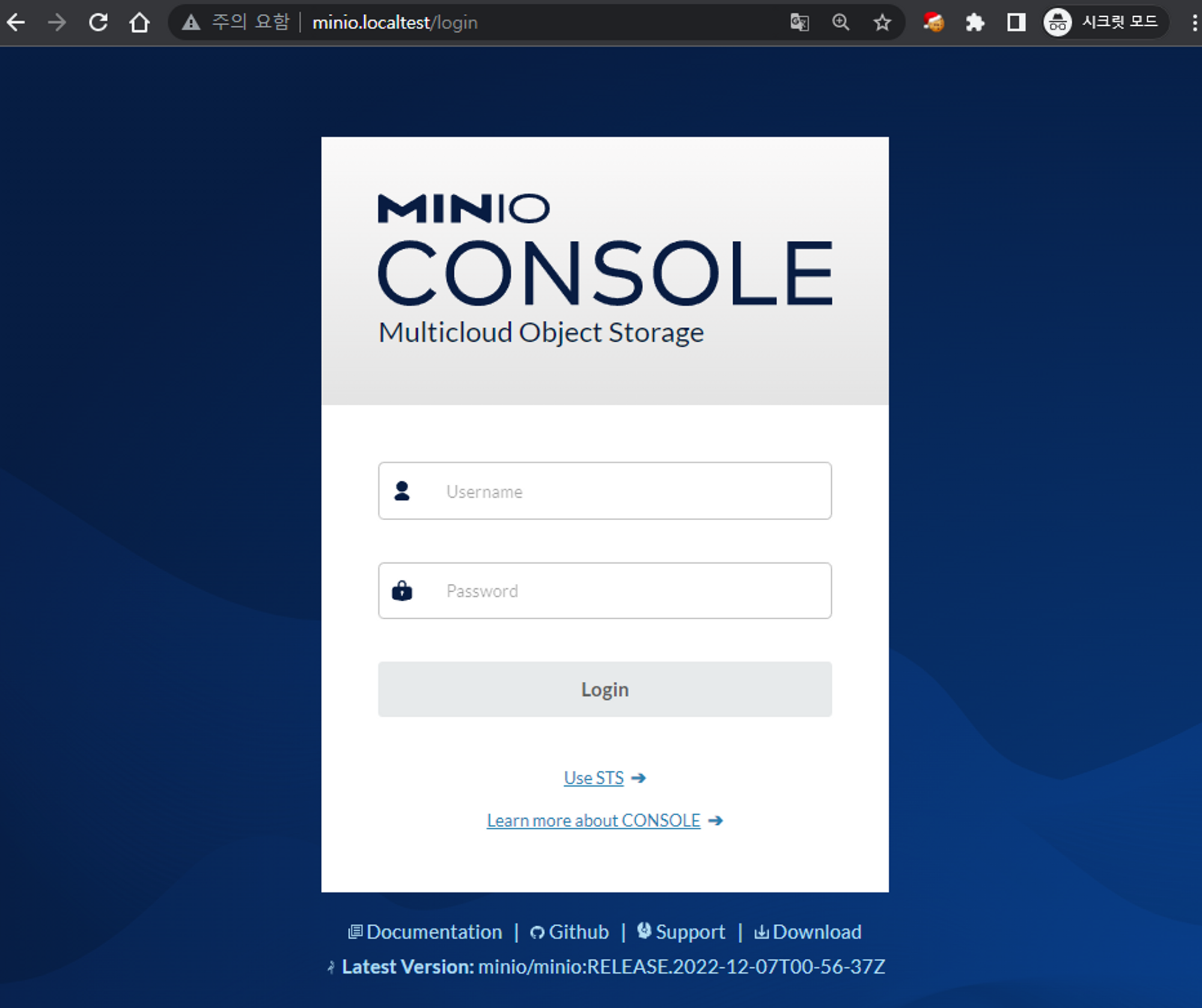 웹 브라우저에서 https://minio.localtest로 접속하면 minio로그인 페이지에 접속됩니다. 계정은 argowf이고 비밀번호는 password입니다. 계정과 비밀번호는 secret에 설정되어 있습니다.