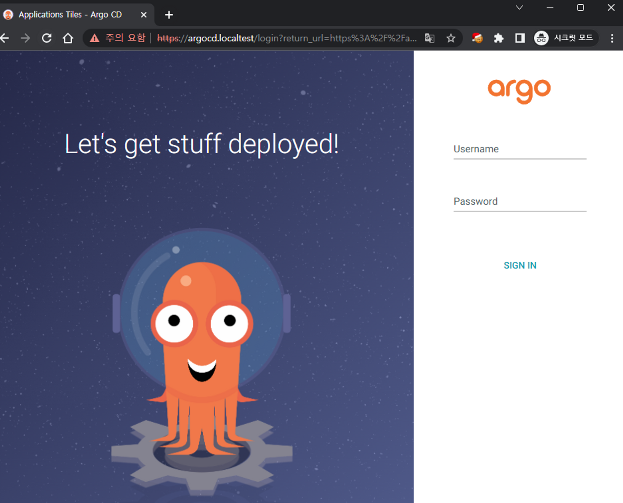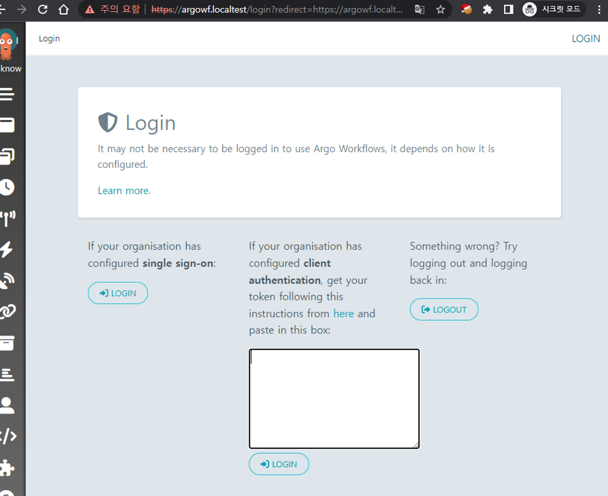 https://argowf.localtest에 접속하면 argo workflow로그인 페이지가 나옵니다.