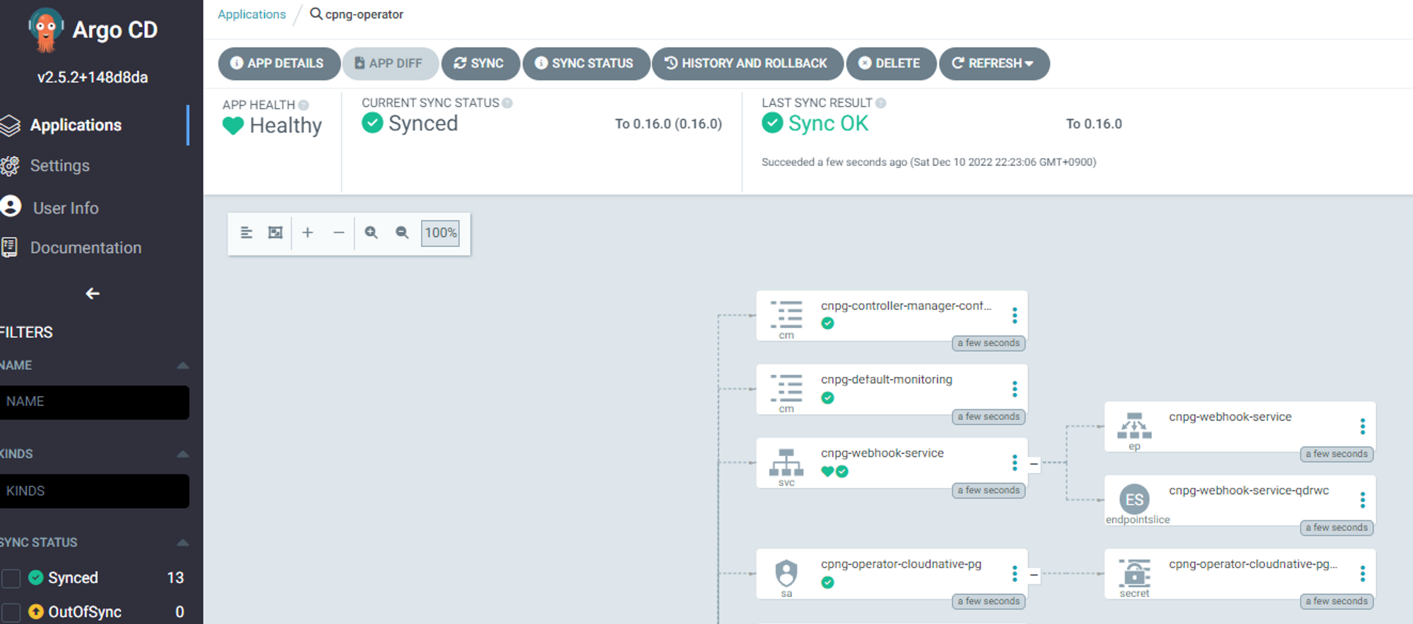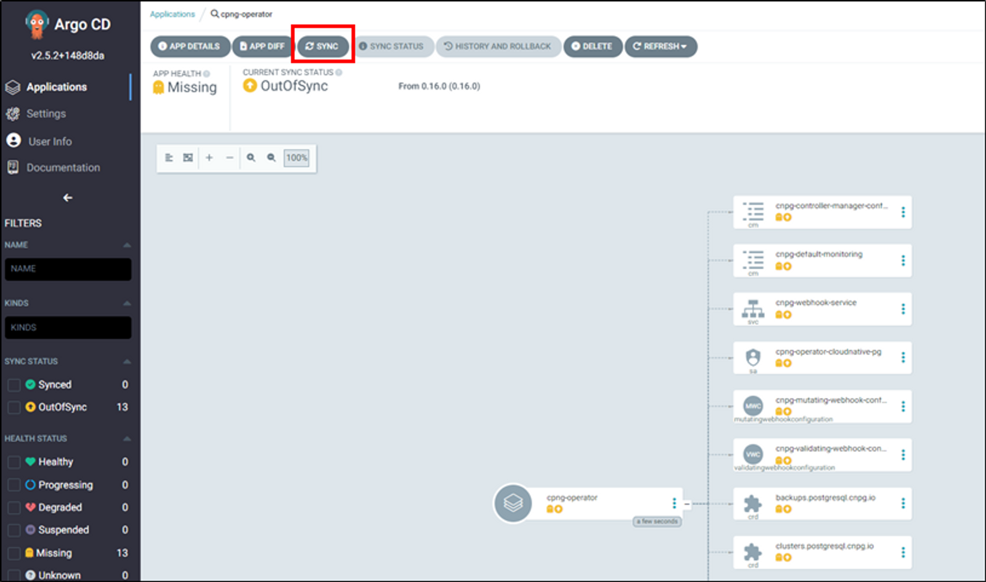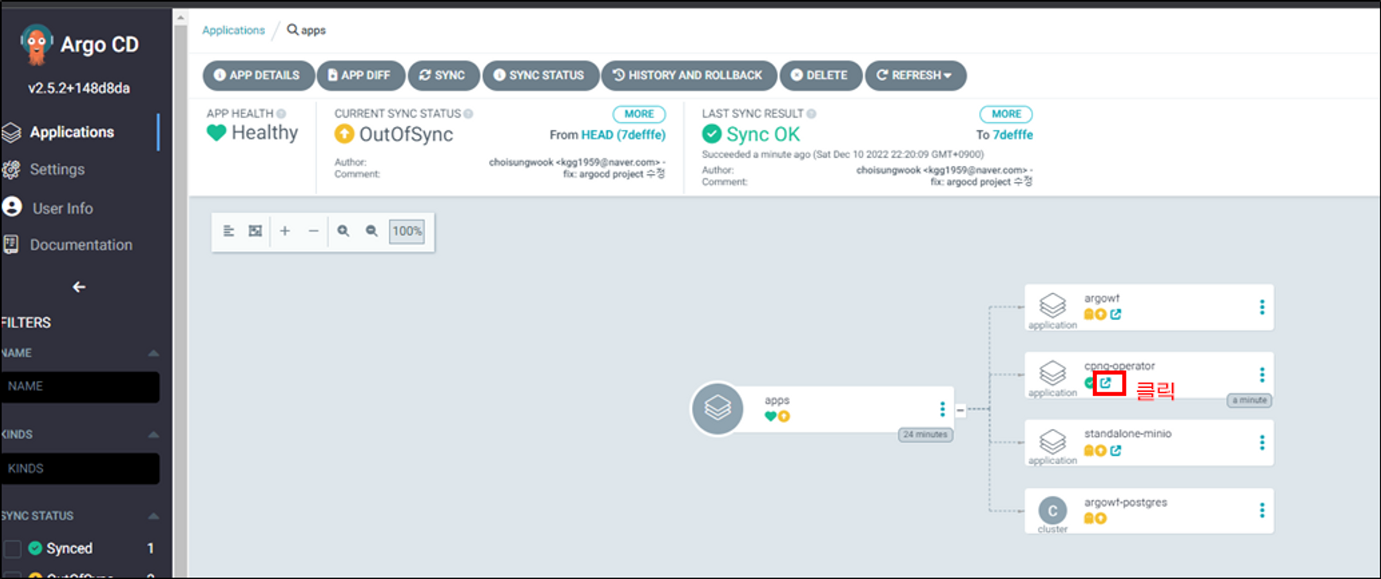 cnpg-operator application을 sync합니다. sync가 성공하면 application이 생성됩니다. 링크버튼을 클릭하면 application페이지로 이동됩니다.