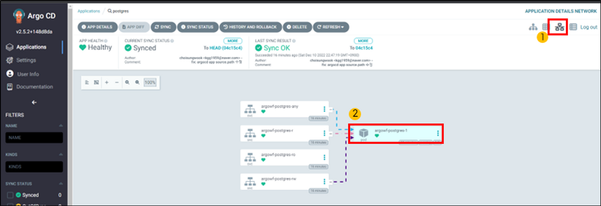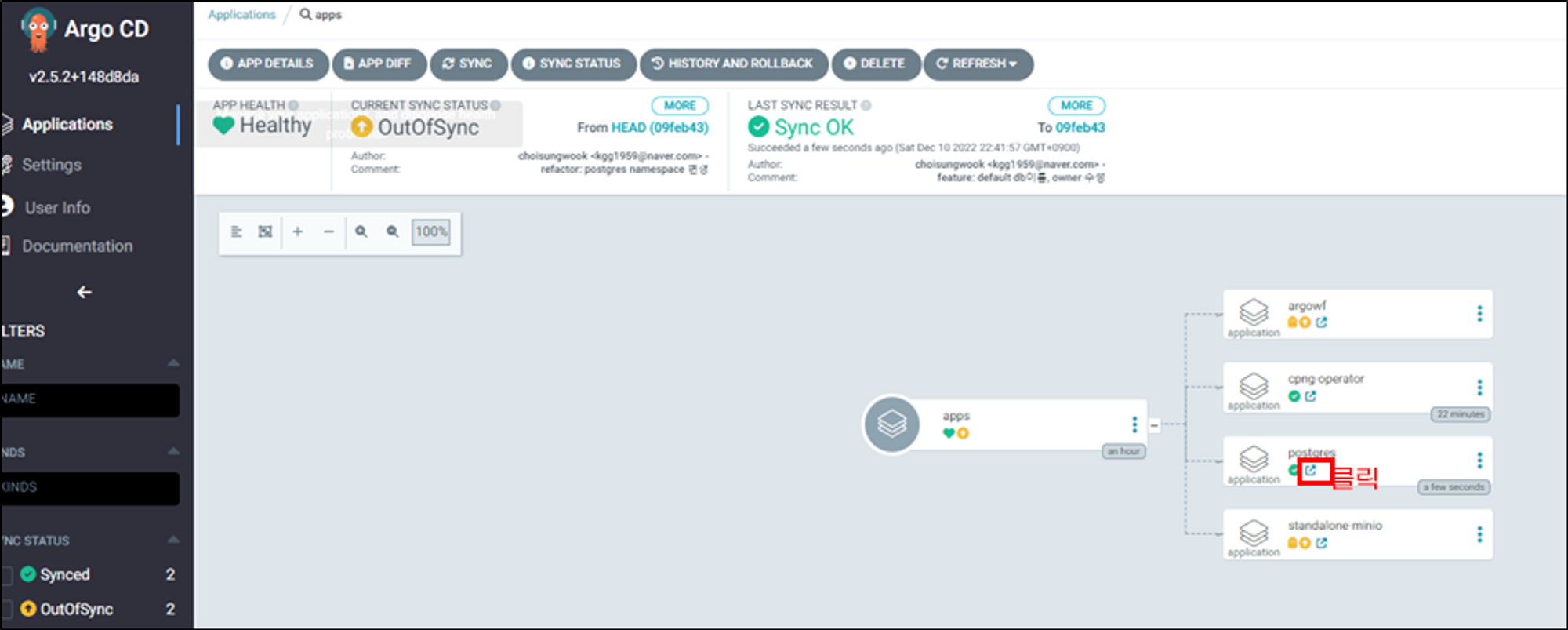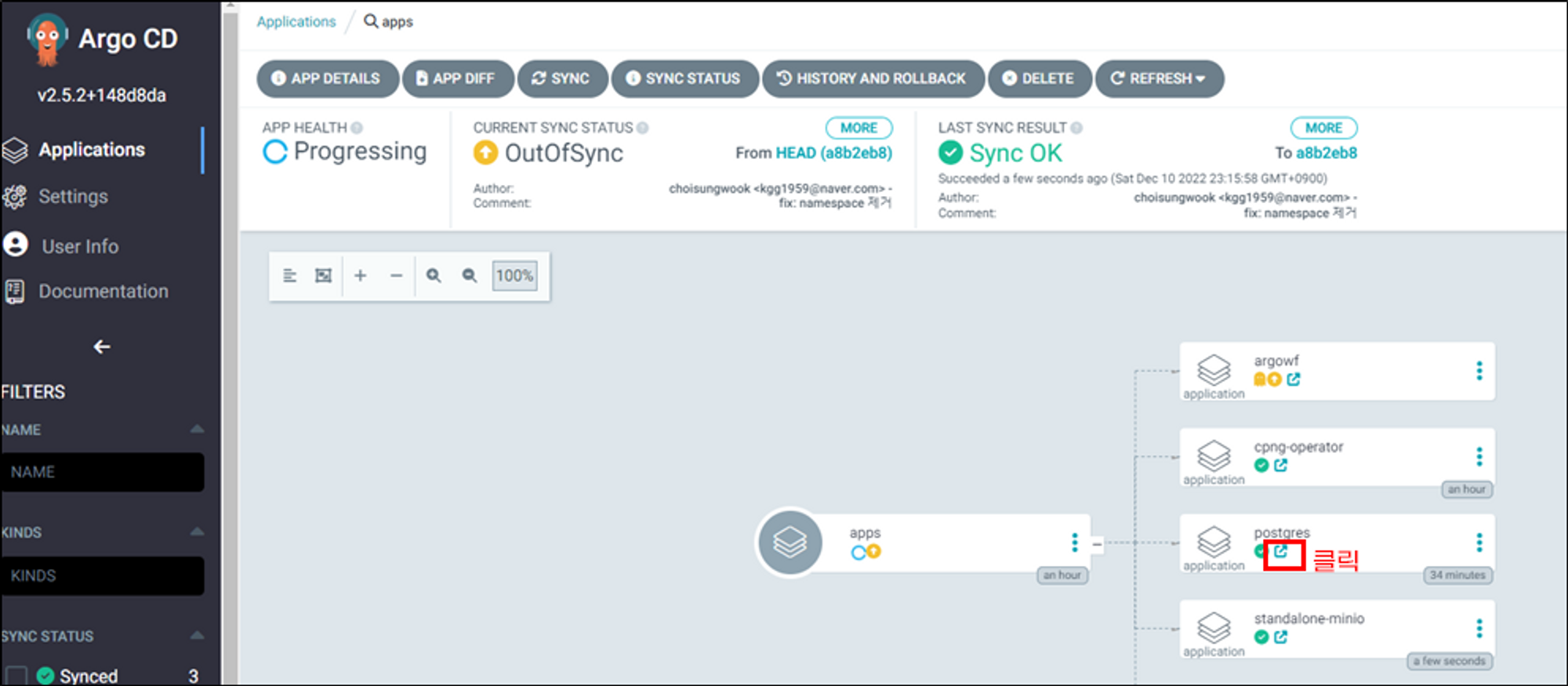 postgresql application이 sync가 되었는지 확인합니다. 그리고 application상세페이지로 이동합니다.