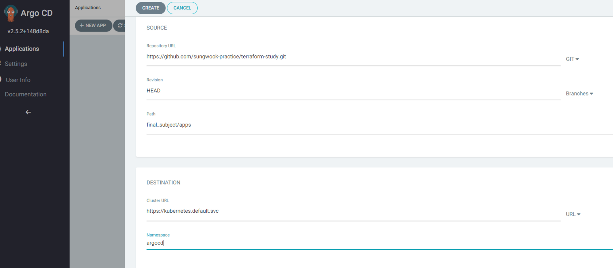 생성한 repo를 이용하여 app of apps argocd application을 생성합니다. source.path는 apps폴더가 있는 경로를 설정합니다. 주의할 점은 destination.namespace가 꼭 argocd여야 합니다. argocd디폴트 설정으로 argocd namespace에만 application을 생성할 수 있기 때문입니다.