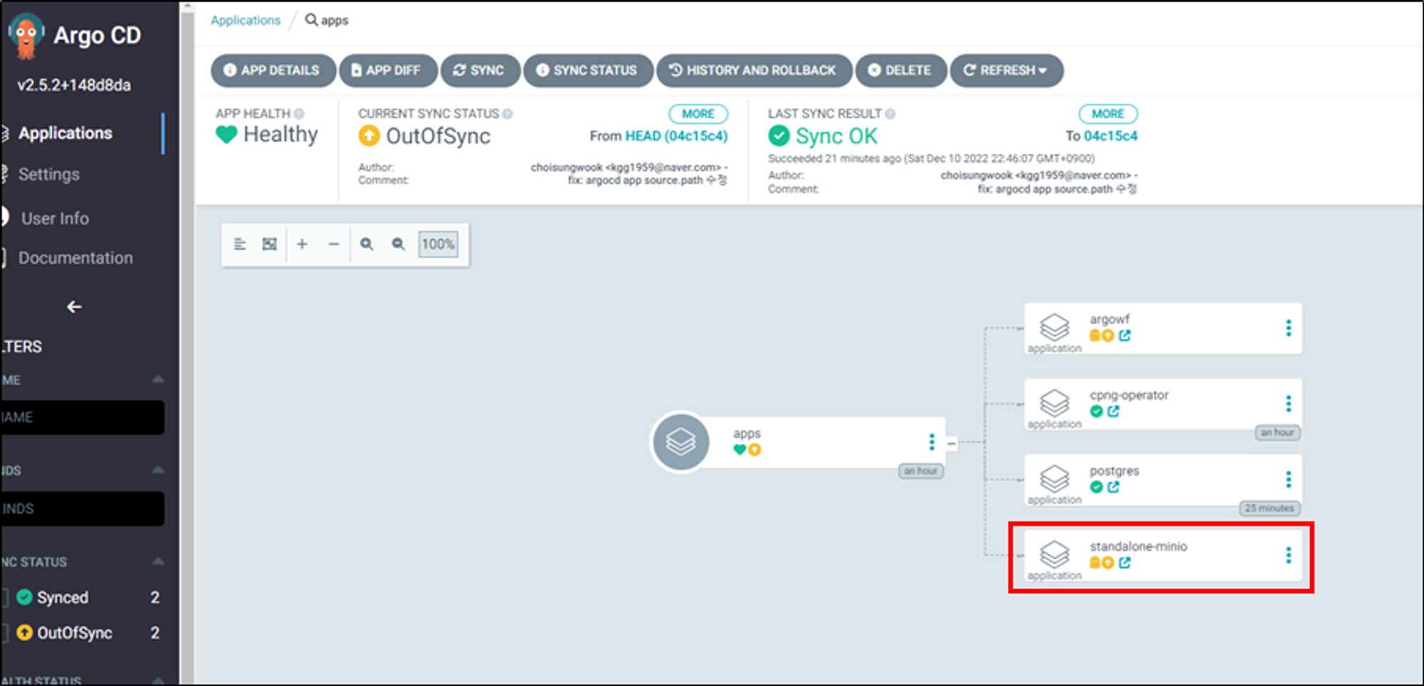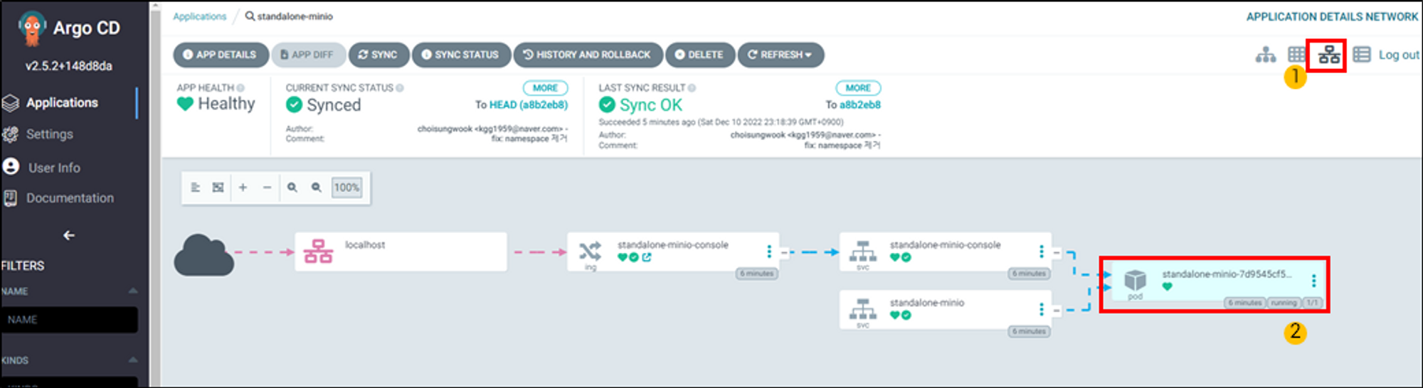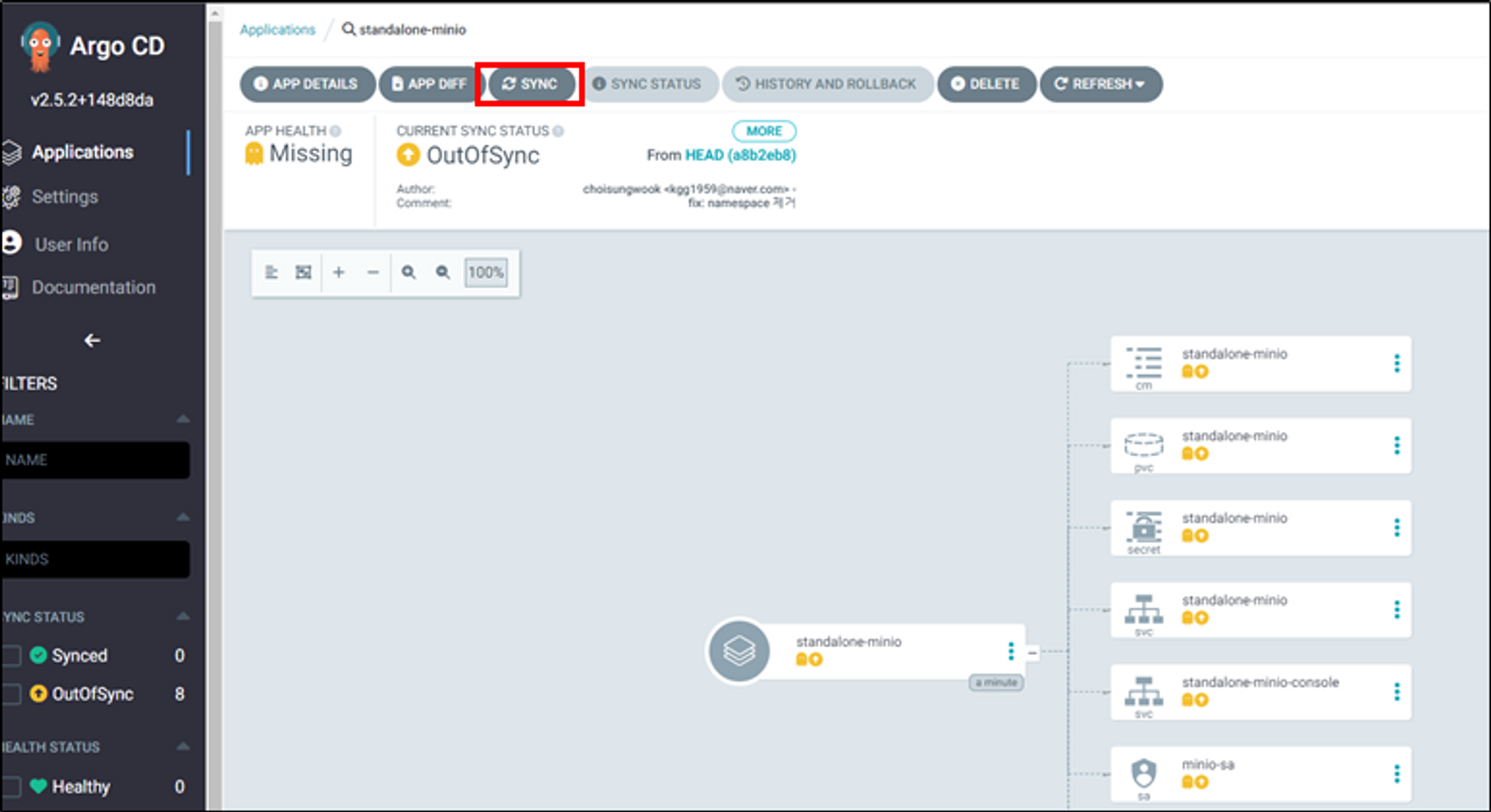 app of app application에서 minio application을 sync합니다.