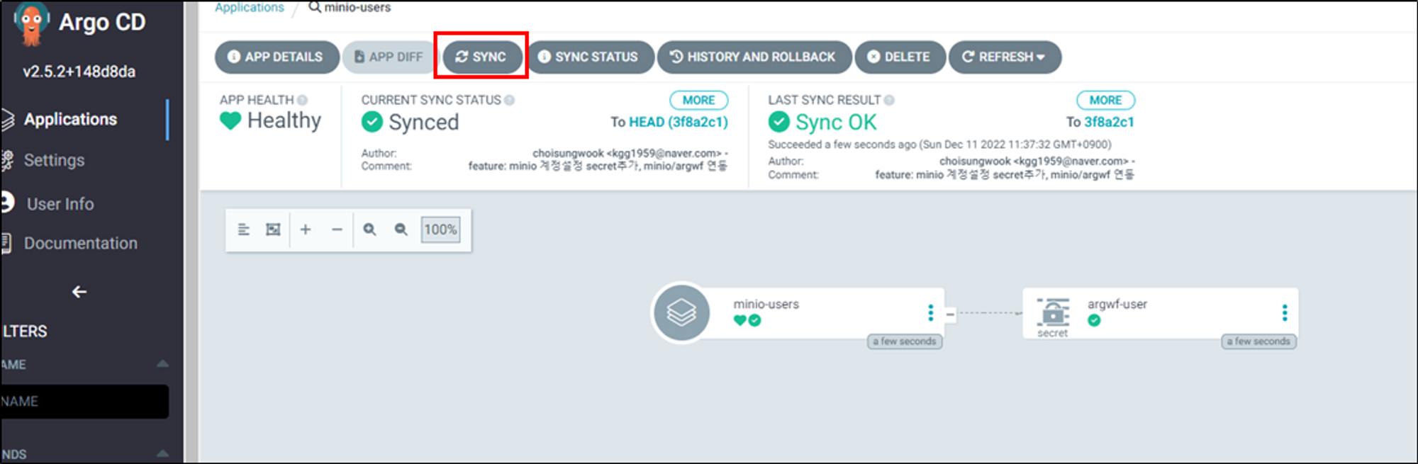 생성한 argocd application을 sync하여 minio access_key를 추가합니다.