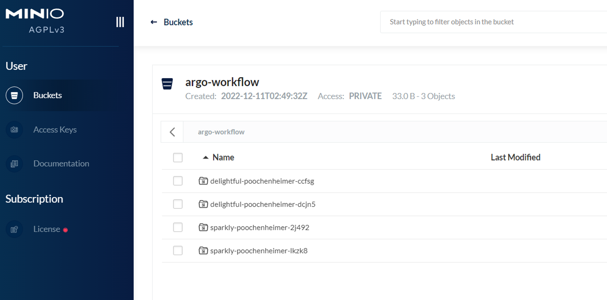 minio bucket에 접속하면 workflow 아티팩트가 존재합니다.