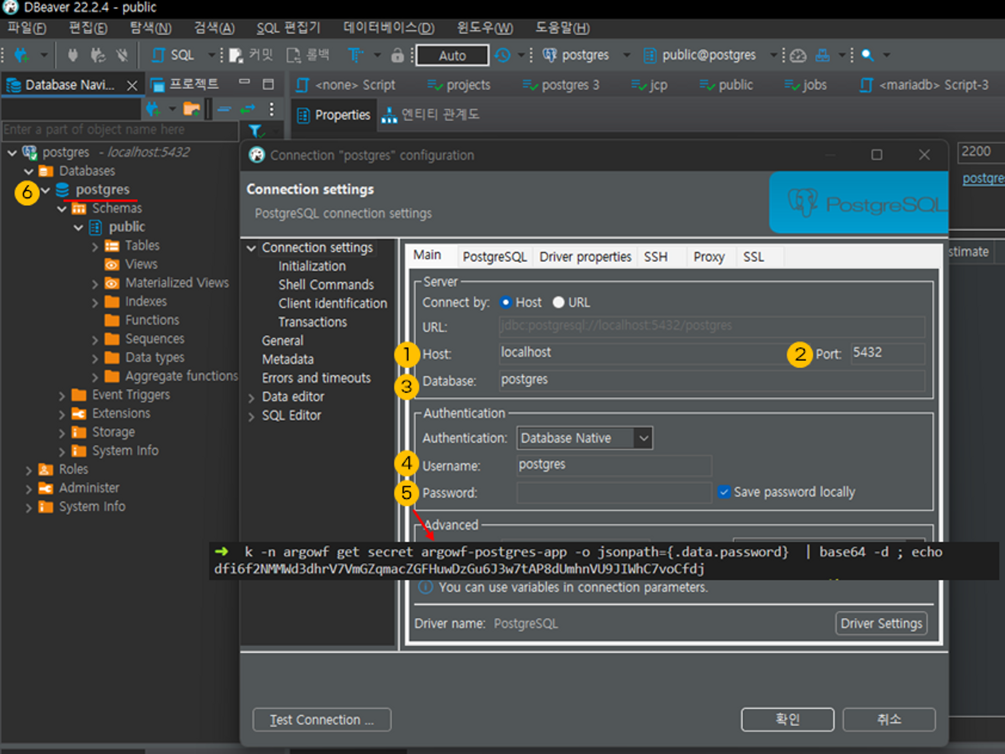 postgres client로 127.0.0.1:5432로 연결합니다. 저는 Dbeaver를 사용했습니다. 잘 접속된다면 아래 그림 6번처럼 postgres DB가 보입니다.