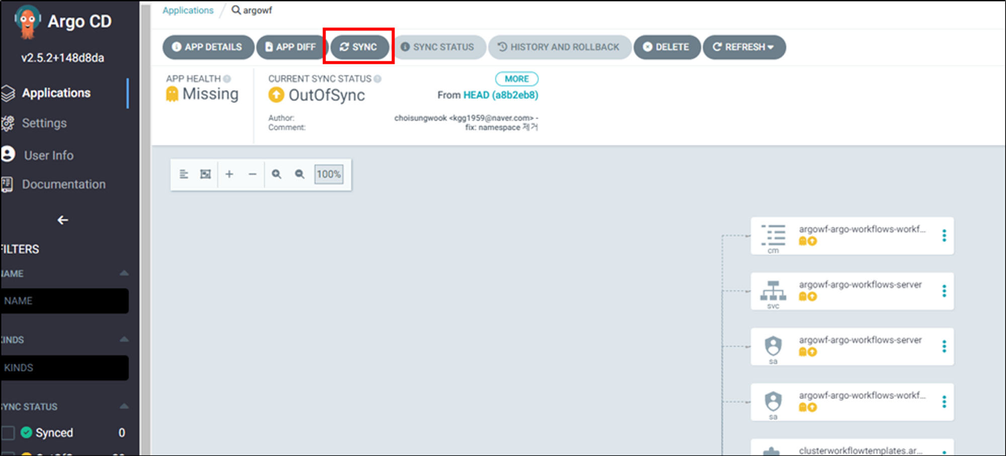 sync버튼을 눌러 argo workflow리소스를 동기화합니다.