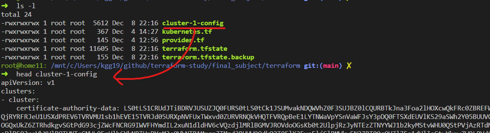 쿠버네티스 클러스터 생성되면서 같이 생성된 context는 테라폼 명령어를 실행한 root경로에 생성됩니다.