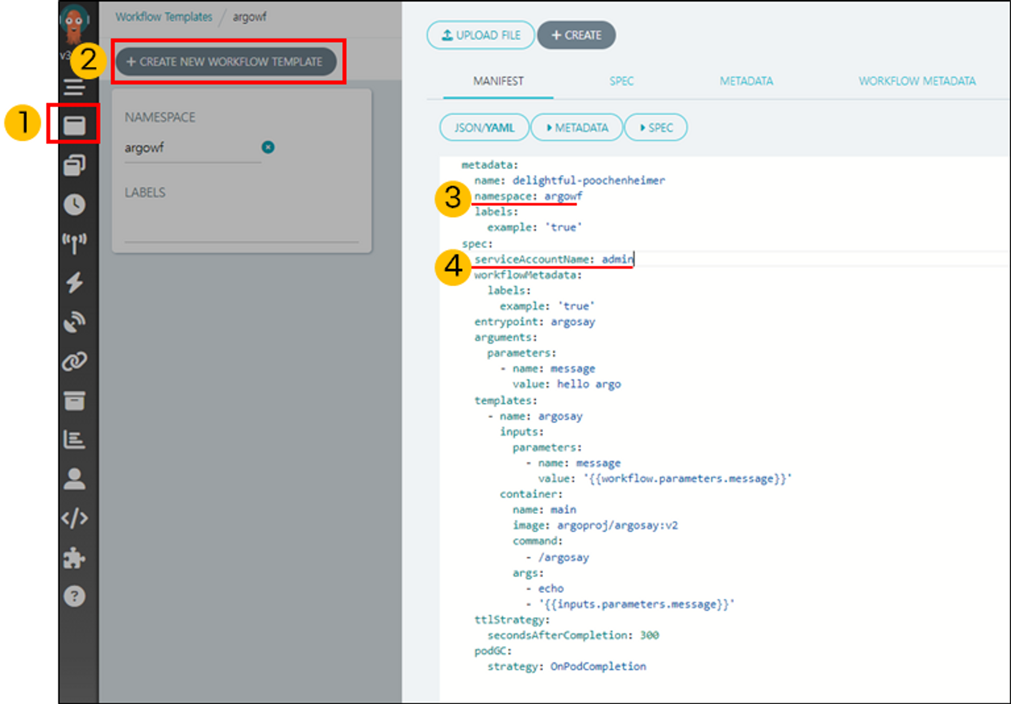 argo workflow 2번째 메뉴에서 샘플 workflowtemplate를 생성합니다. namespace와 serviceaccount를 꼭 설정해야 합니다.