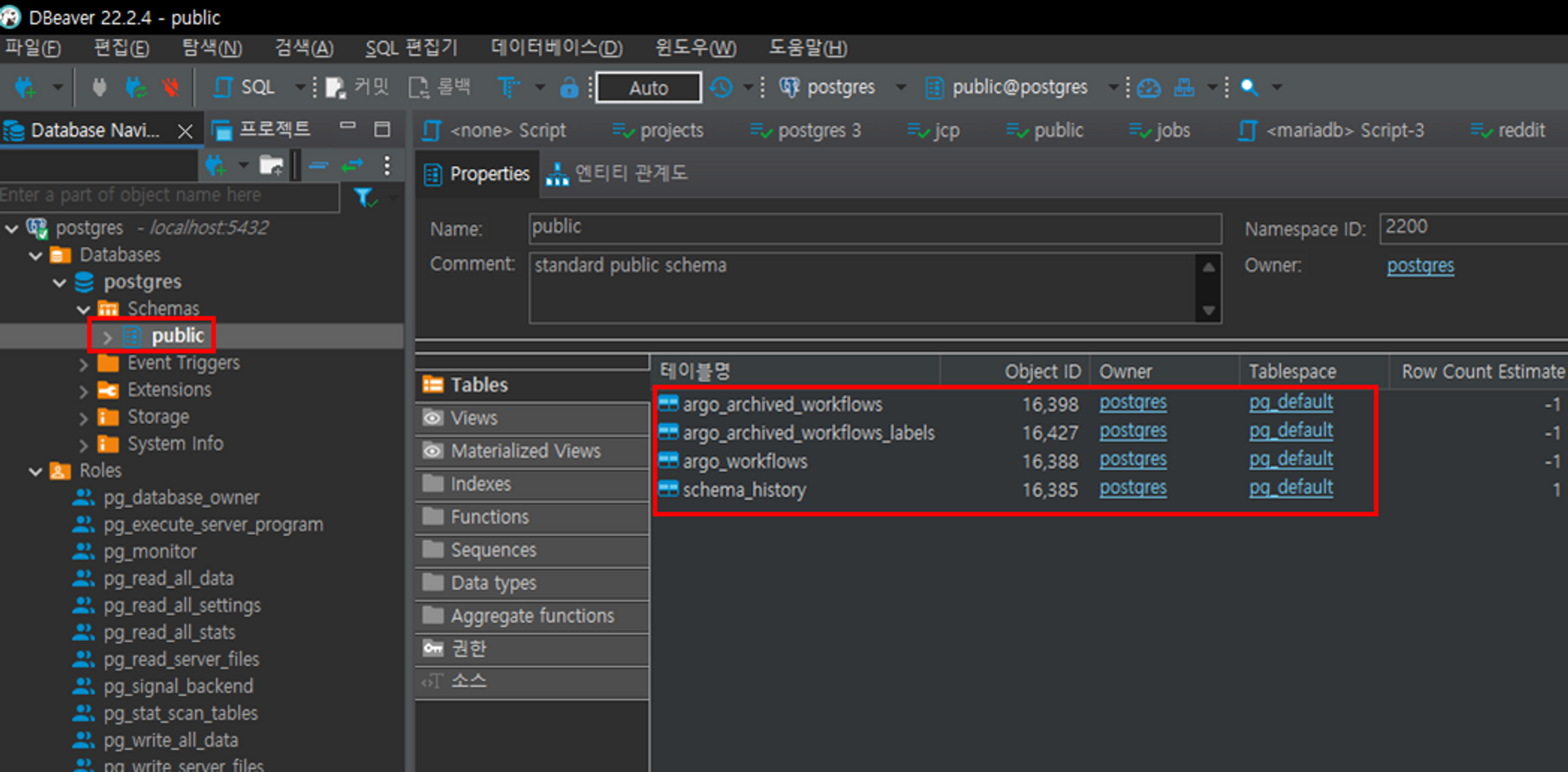 postgres에 접속하면 argo workflow에 관련된 table이 생성되어 있습니다.