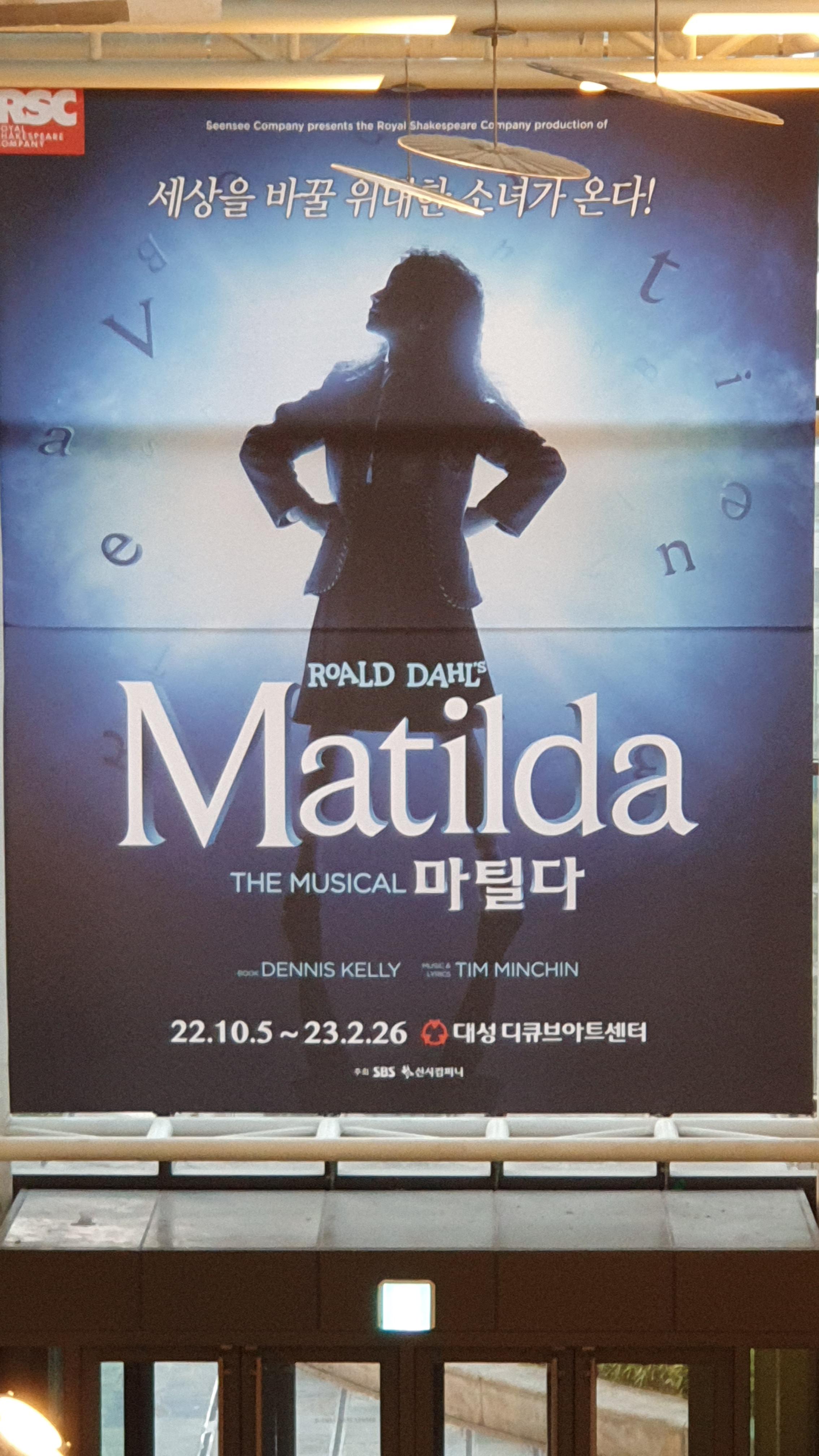 12.9(토)일에 신도림 대성디큐브아트센터에서 뮤지컬 마틸다를 봤습니다. 한번 더 보고 싶을 만큼 매우 재밌게 봤습니다. 처음 뮤지컬을 봤는데 신기하게도 영화처럼 쭉 사영되는 것이 아니라 쉬는시간이 존재했어요! 70분 공연, 10분 쉬는 시간, 70분 공연으로 진행되었습니다.