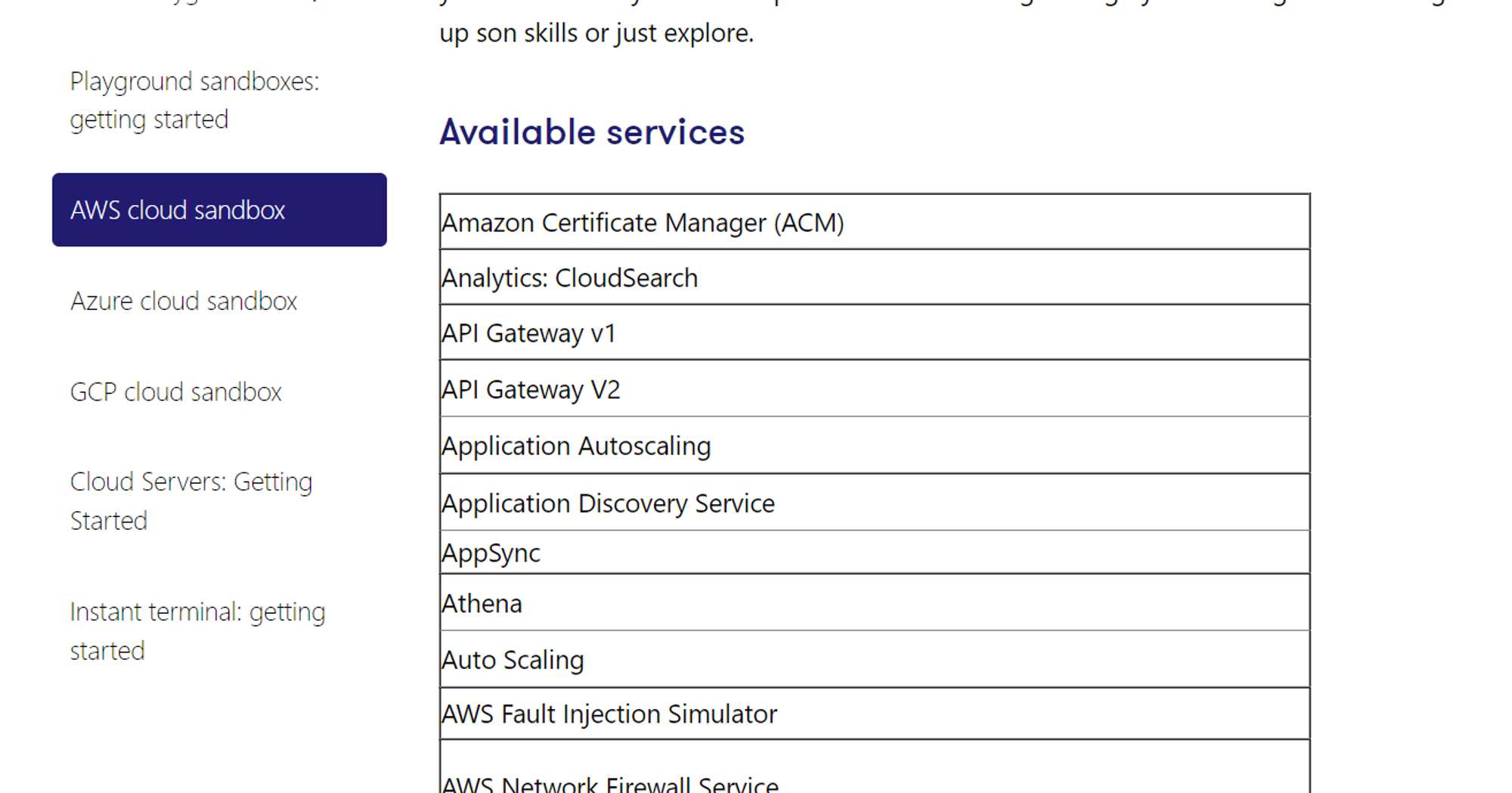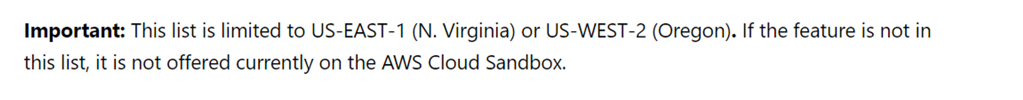 샌드박스로 실행되기 때문에 조금 제약적으로 환경이 제공됩니다. US-EAST-1과 US-WEST-2 리전만 사용할 수 있습니다.