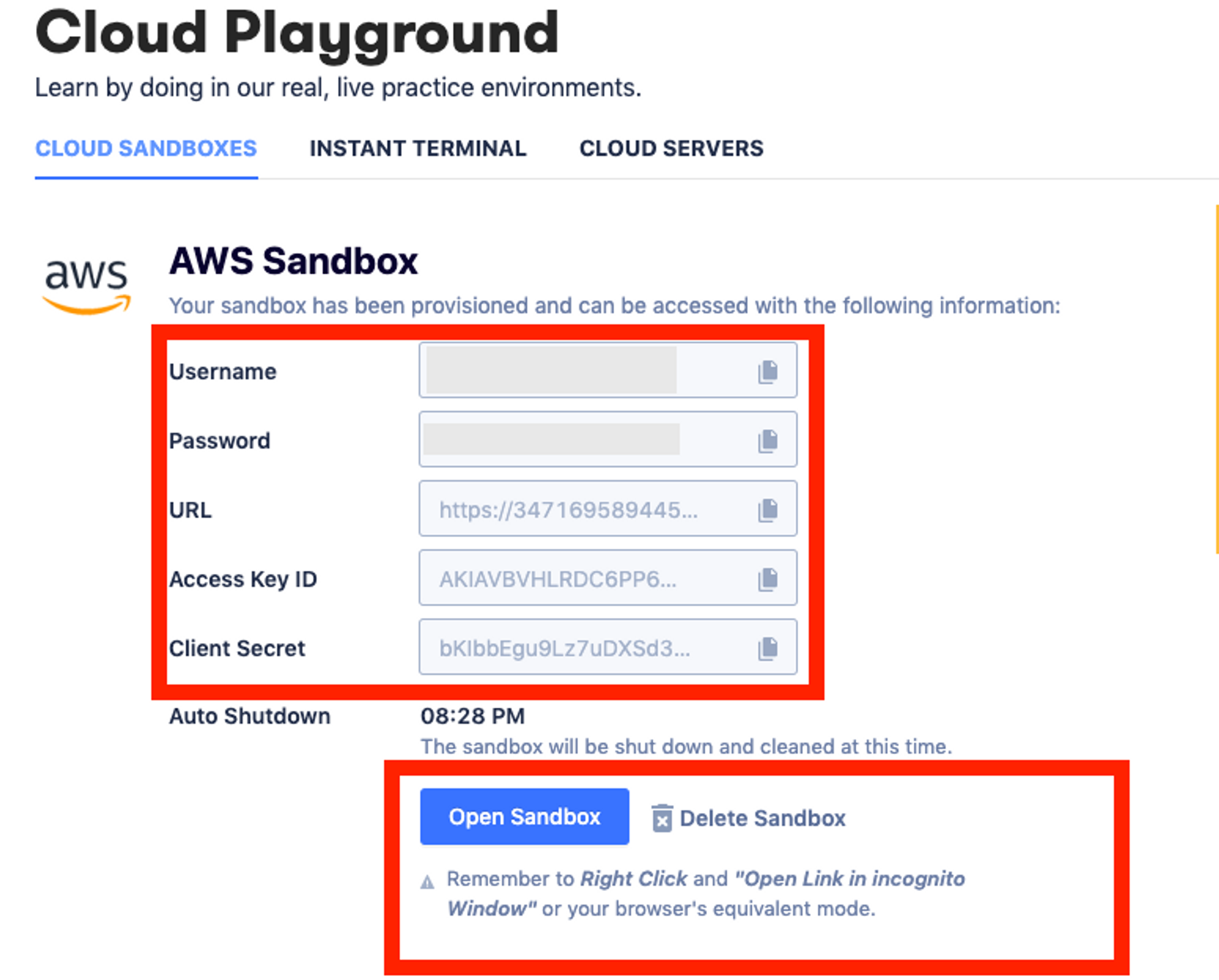 언제든이 Sandbox를 실행하면 4시간동안 사용할 수 있는 임시 샌드박스 환경을 얻을 수 있습니다. 샌드박스에서 제가 무엇을 하든 비용이 무료입니다. 제가 개인비용으로 결재해서 연습하는것 보다 훨씬 싼값입니다. 아래 예제는 aws 샌드박스를 실행한 예입니다. 샌드박스를 생성하면 계정, 비밀번호, 액세스 키 등 접속정보와 종료시간을 알려줍니다.