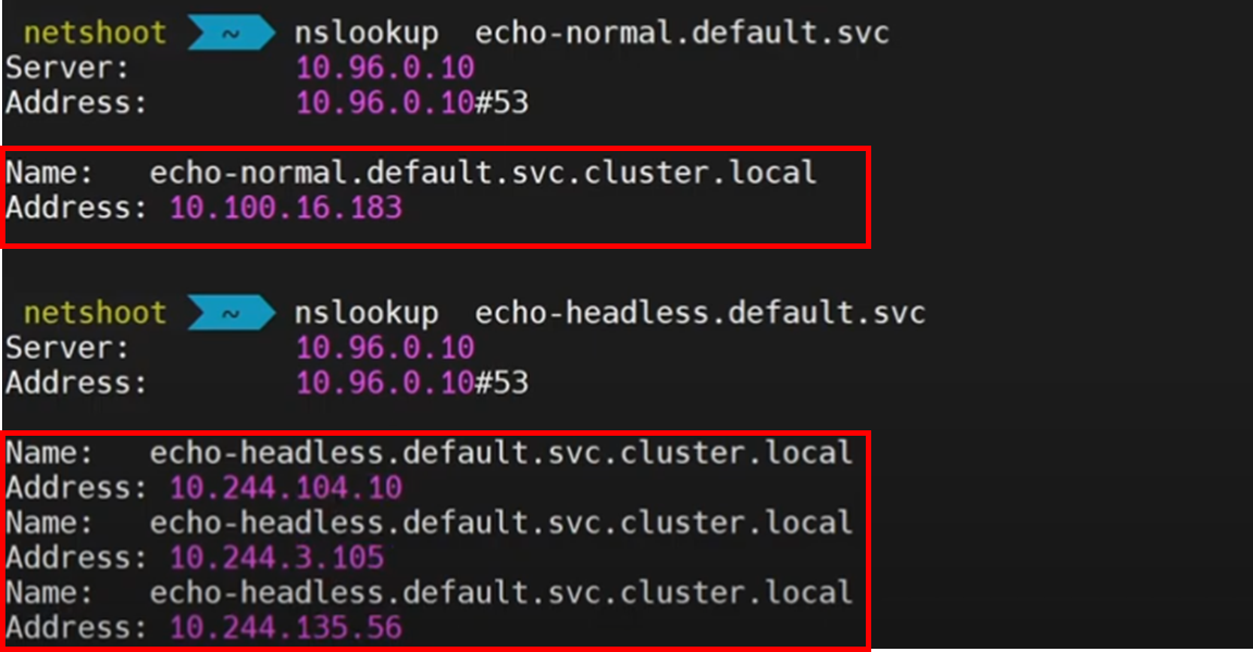 nslookup으로 테스트해보면 서비스와 headless서비스 차이를 확인할 수 있습니다. 일반 서비스는 서비스의 clusterIP가 조회되지만 headless서비스는 pod IP목록이 조회됩니다.