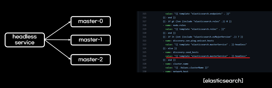 예로 Elsaticsearch helm chart에서 headless서비스를 사용하여 master목록을 관리합니다.