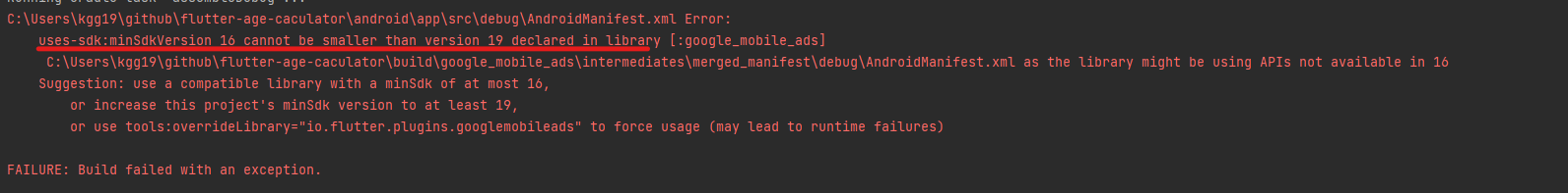 flutter에서 빌드 시, 특정 라이브러리가 minsdk버전을 충족하지 못하면 아래와 같은 에러가 발생니다.