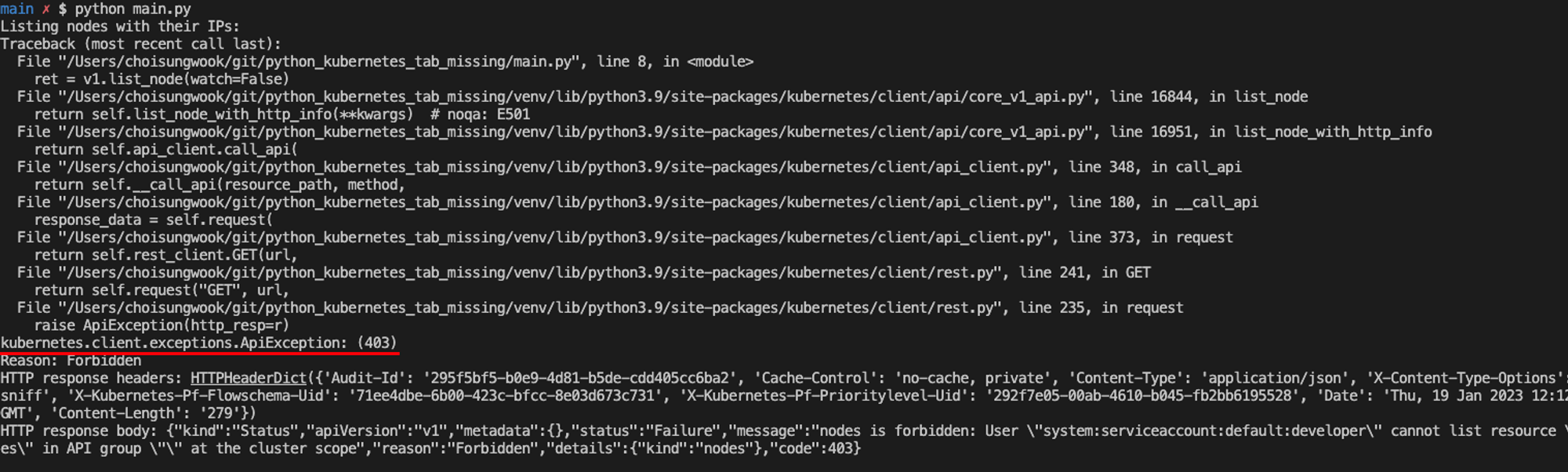 python code를 실행합니다. kubernetes 패키지가 필요합니다. 실행하면 403 예외가 발생합니다. developer계정에 role이 없기 때문입니다.