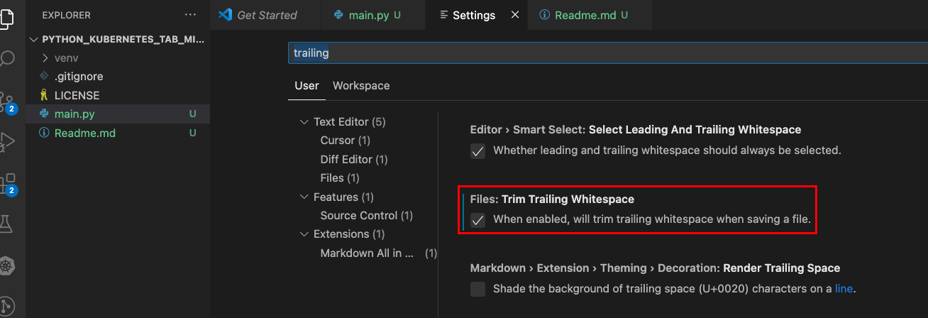자기도 모르게 줄 끝에 공백 또는 탭이 추가되는 것을 방지하는 방법은 2개가 있는 것 같습니다.