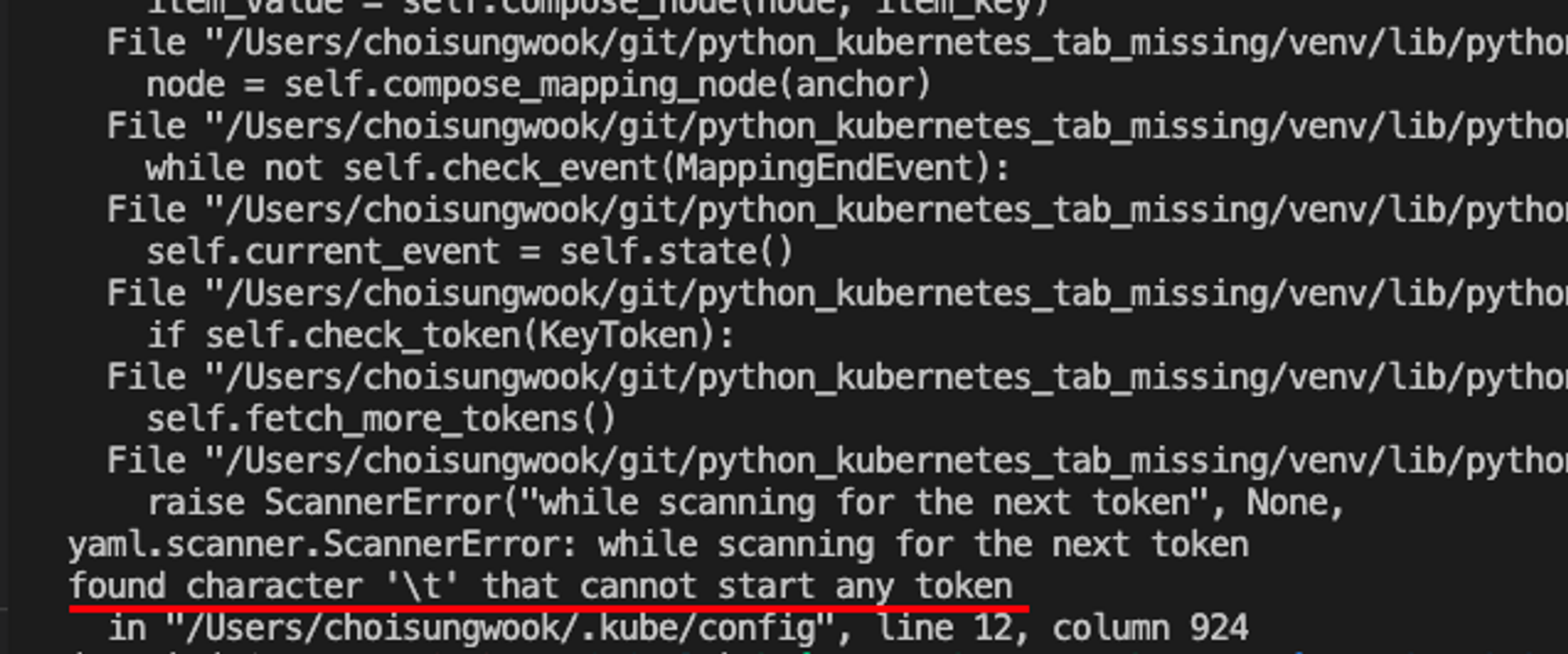 오류는 코드 끝에 탭이 있어 발생했습니다. 토큰 끝에 탭이 있어 쿠버네티스 sdk실행 오류가 발생했습니다.