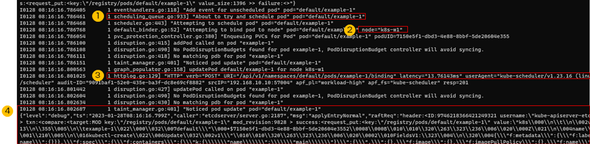 로그를 분석하면 api-server가 생성 요청을 etcd에 기록하는 것부터 시작합니다.그리고 unscheduled pod event를 발생시킵니다.