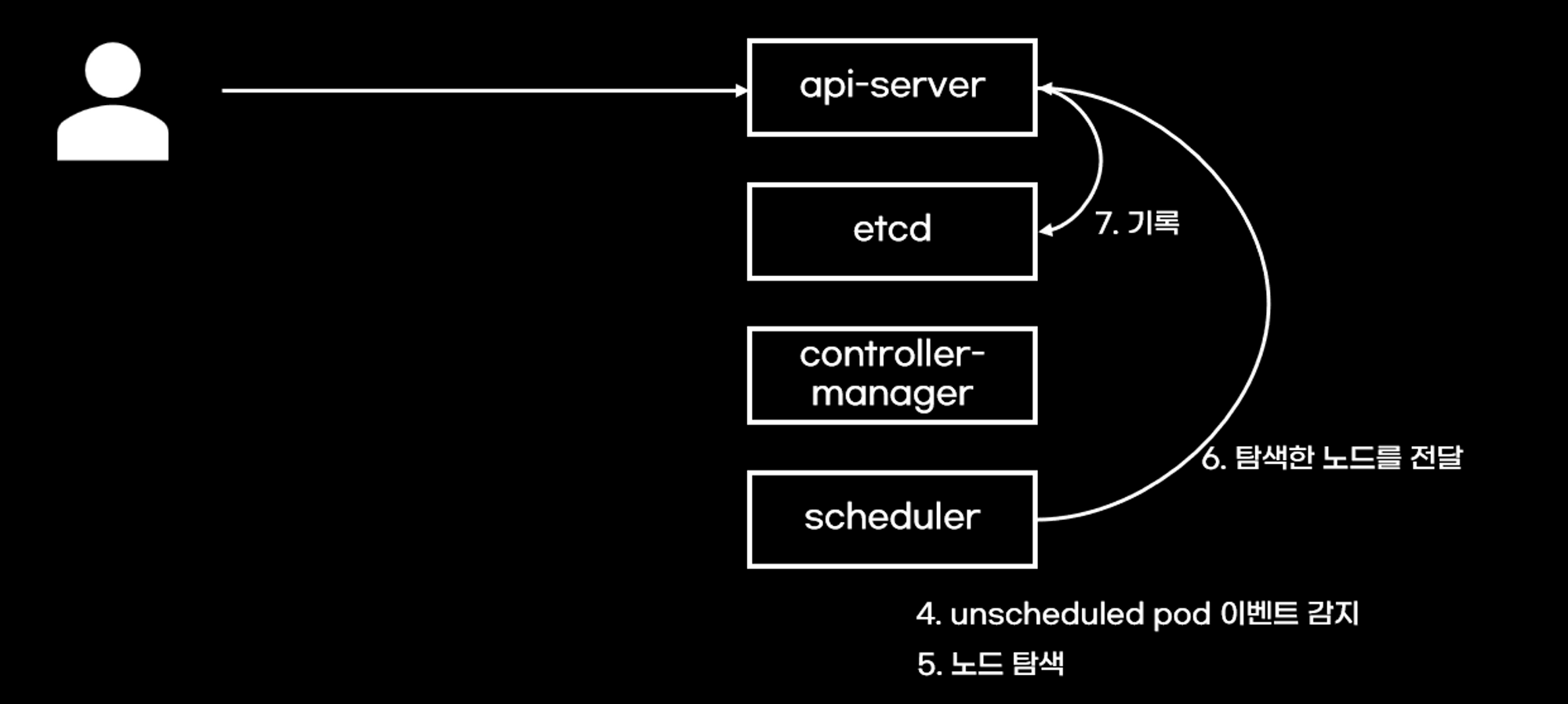 이처럼 deployment controller 상태가 변경 될 때마다 api-server에게 공유하고, api-server는 etcd에 계속 기록합니다. controller 작업이 끝나면 unscheduled pod가 발생하고 scheduler가 스케쥴링을 시작합니다.
