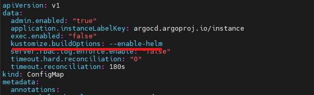 kubernetes configmap에서 argocd-cm에서 kustomize옵션에 --enable-helm을 추가합니다.