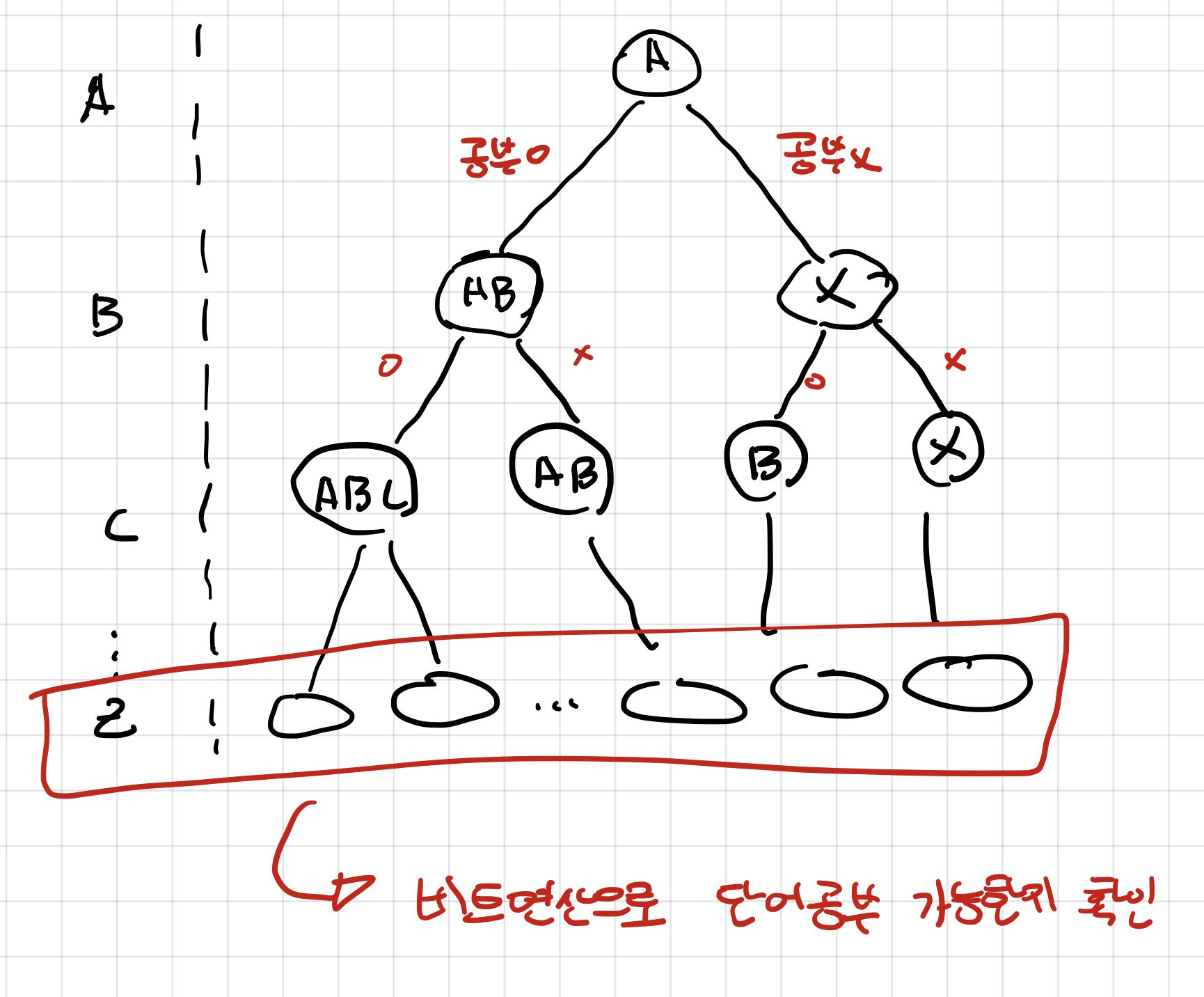 2. 검사로직은 비트연산로 결정되었습니다. 남은 로직은 검사로직에 넘길 인자를 어떻게 만들 것인가입니다. a~z까지 알파벳을 공부할 때 경우의 수는 2개입니다.