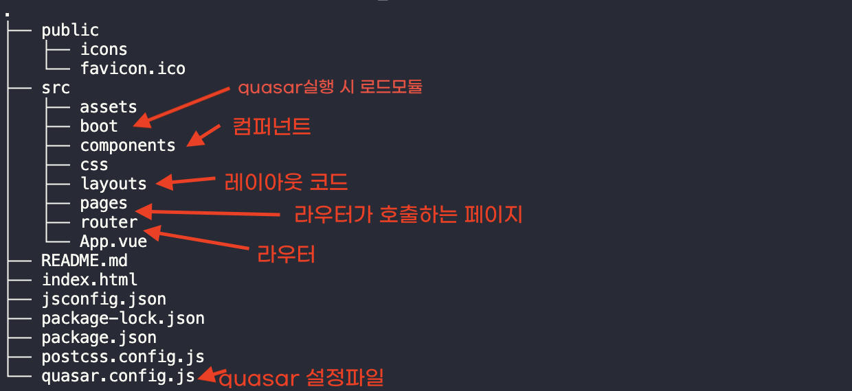 quasar는 컴퍼넌트 구조로 되어 있으므로 pages, components, router를 가집니다. 그리고 quasar가 시작되면 로드하는 boot와 quasar를 설정하는 quasar.config.js파일이 있습니다.