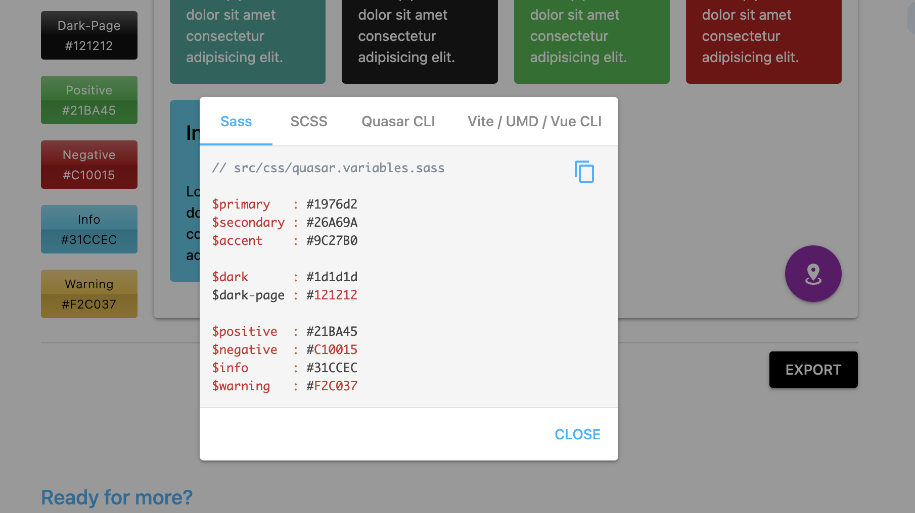 Export버튼을 누르면 변수와 값이 자동으로 추출됩니다. 이 추출된 값을 src/css/quasar.variables.scss에 붙여넣어서 사용할 수 있습니다.