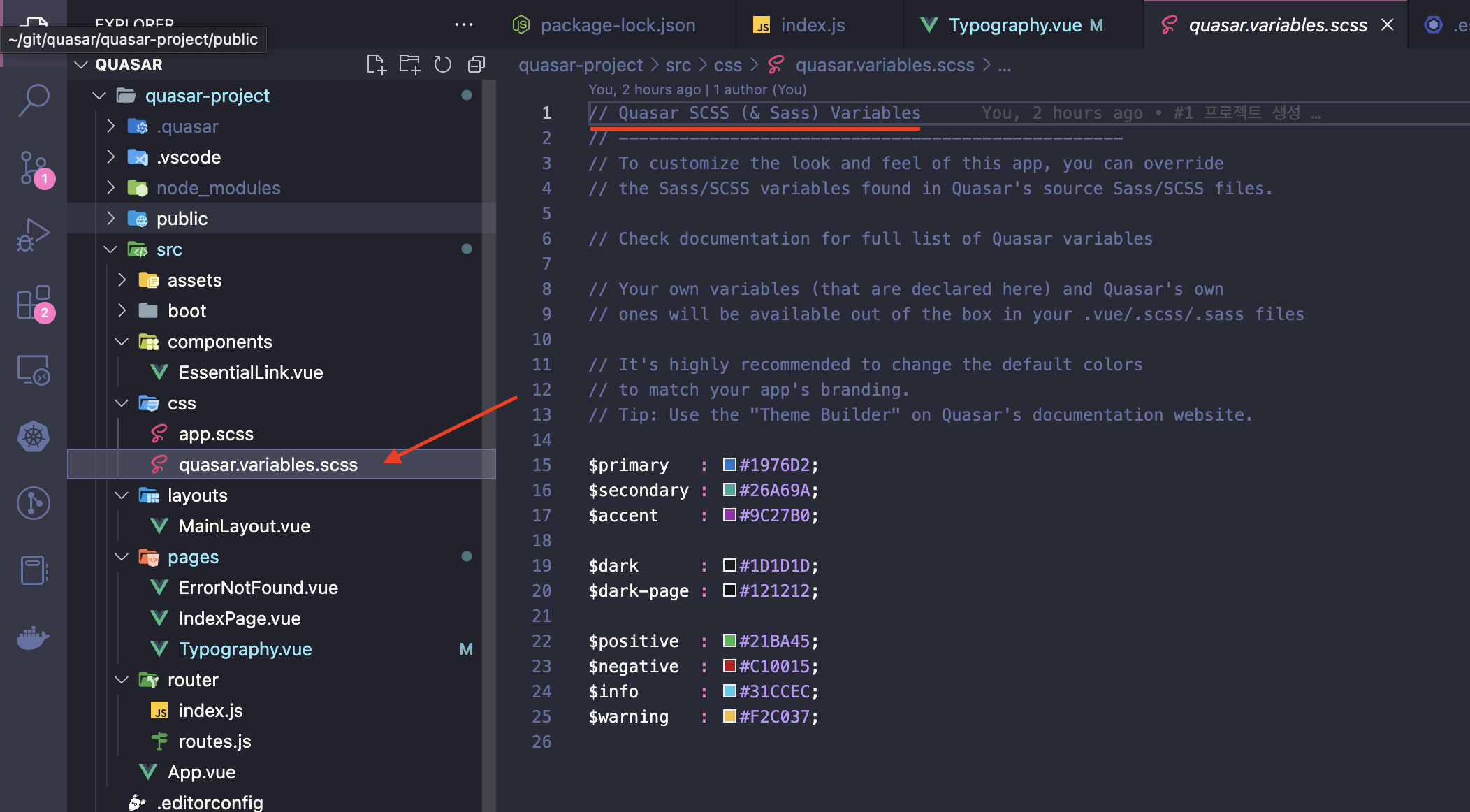 saas 전역변수는 src/css/quasar.variables.scss에 설정되어 있습니다. 변수 값을 수정하면 프로젝트 전체에 영향을 미칩니다.
