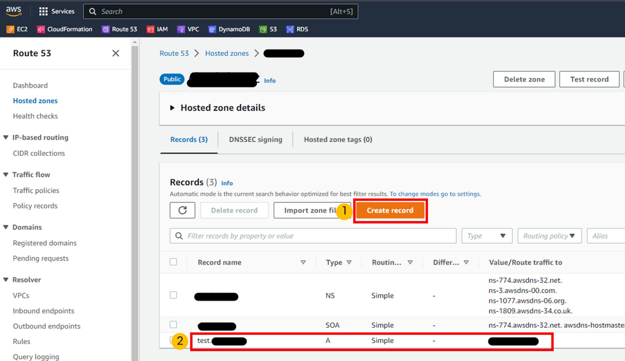 연결이 제대로 되었는지 확인하기 위해 테스트 record를 만듭니다. A record type을 선택하고, record는 "test.xxx"로 설정합니다.
