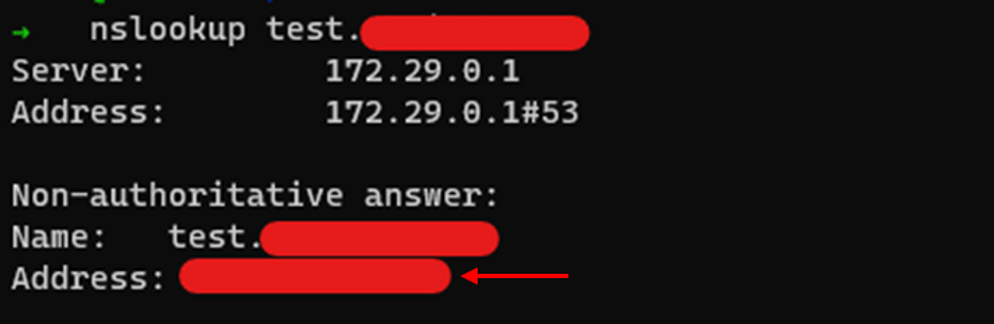 nslookup으로 등록한 test record를 조회하면 응답이 옵니다. 응답에서 Address가 없다면 아직 가비아와 nameserver가 연동되지 않았습니다. 시간을 더 기다려서 다시 nslookup을 시도해보세요.
