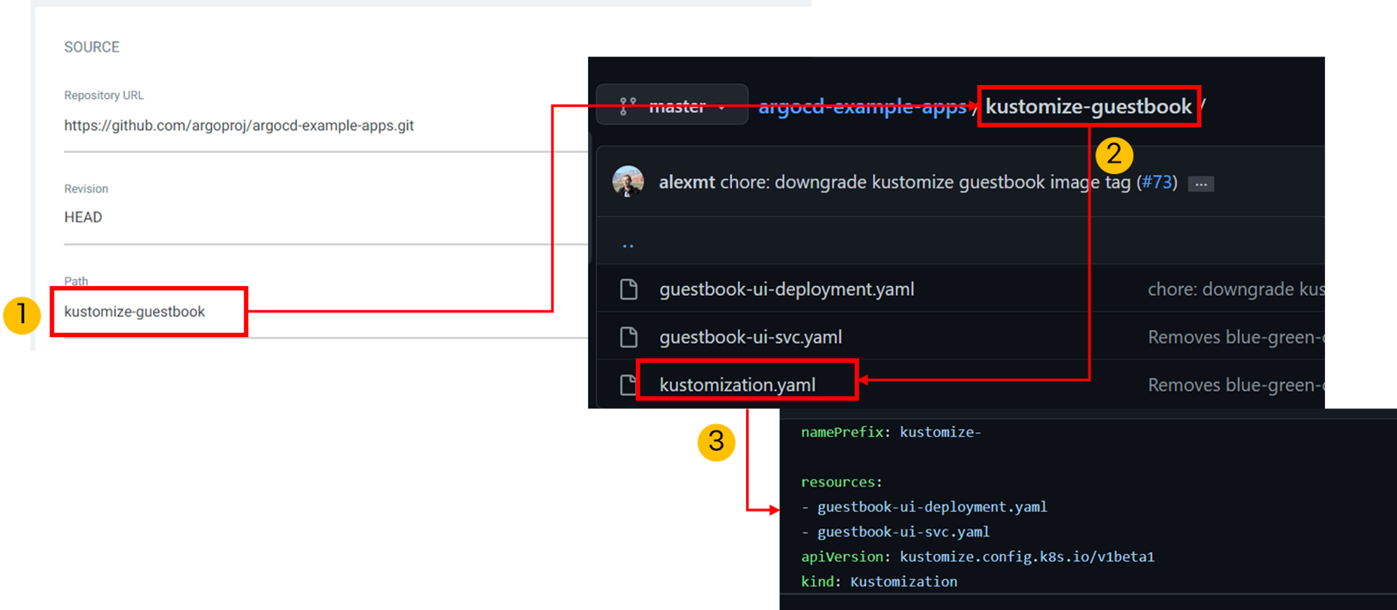 아래 그림은 Argo CD 공식 예제 (https://github.com/argoproj/argocd-example-apps/blob/master/kustomize-guestbook/kustomization.yaml)를 사용했습니다. kustomization.yaml파일이 있어 Argo CD는 kustomize build명령어 실행합니다.