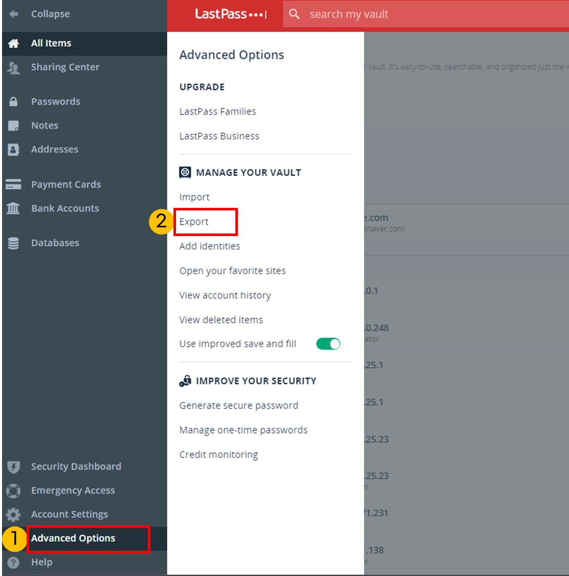 lastpass에서 [Advanced Options] → [Export]를 메뉴를 클릭합니다. 이 메뉴는 현재 lastpass데이터를 csv파일로 추출해줍니다.