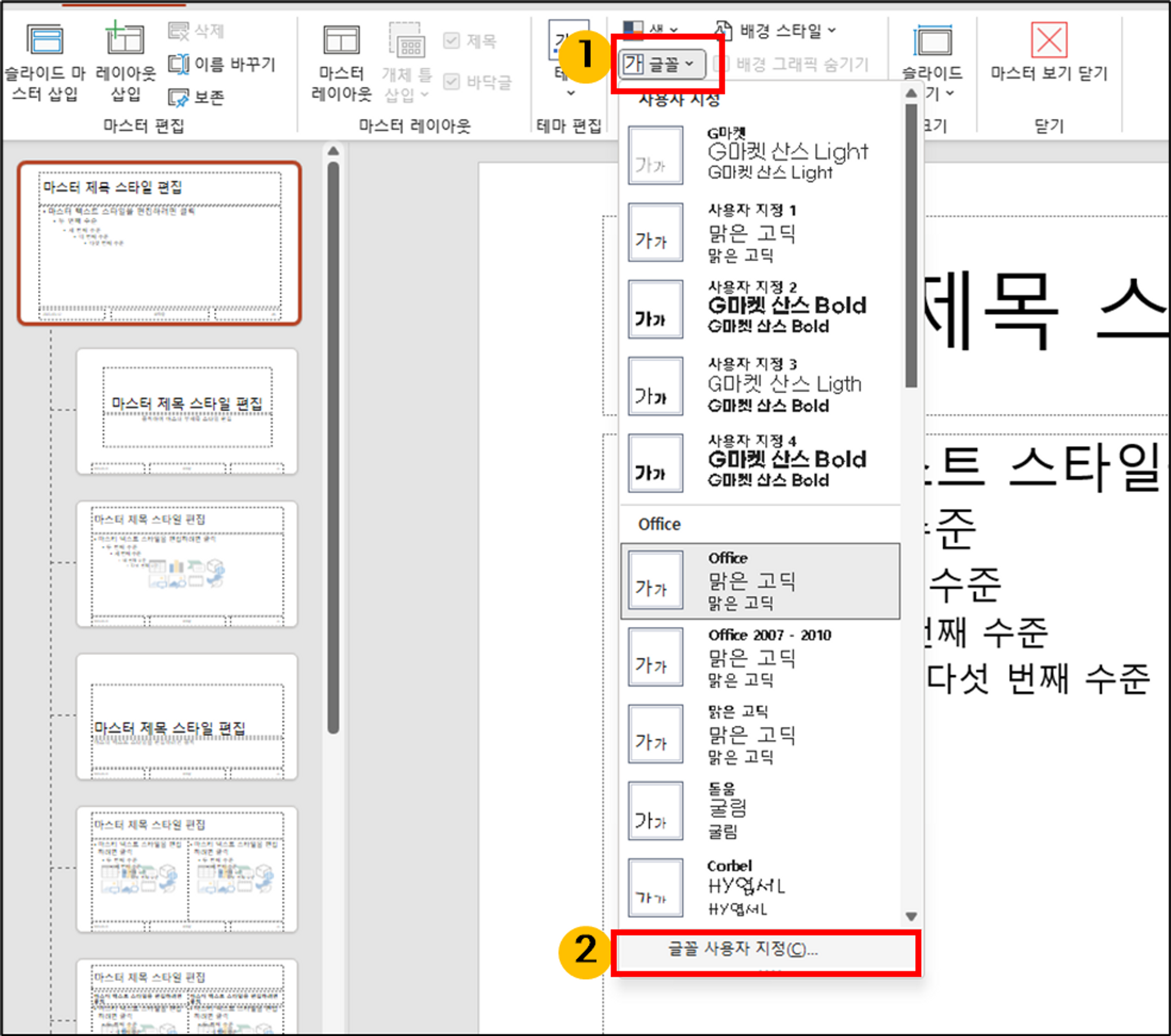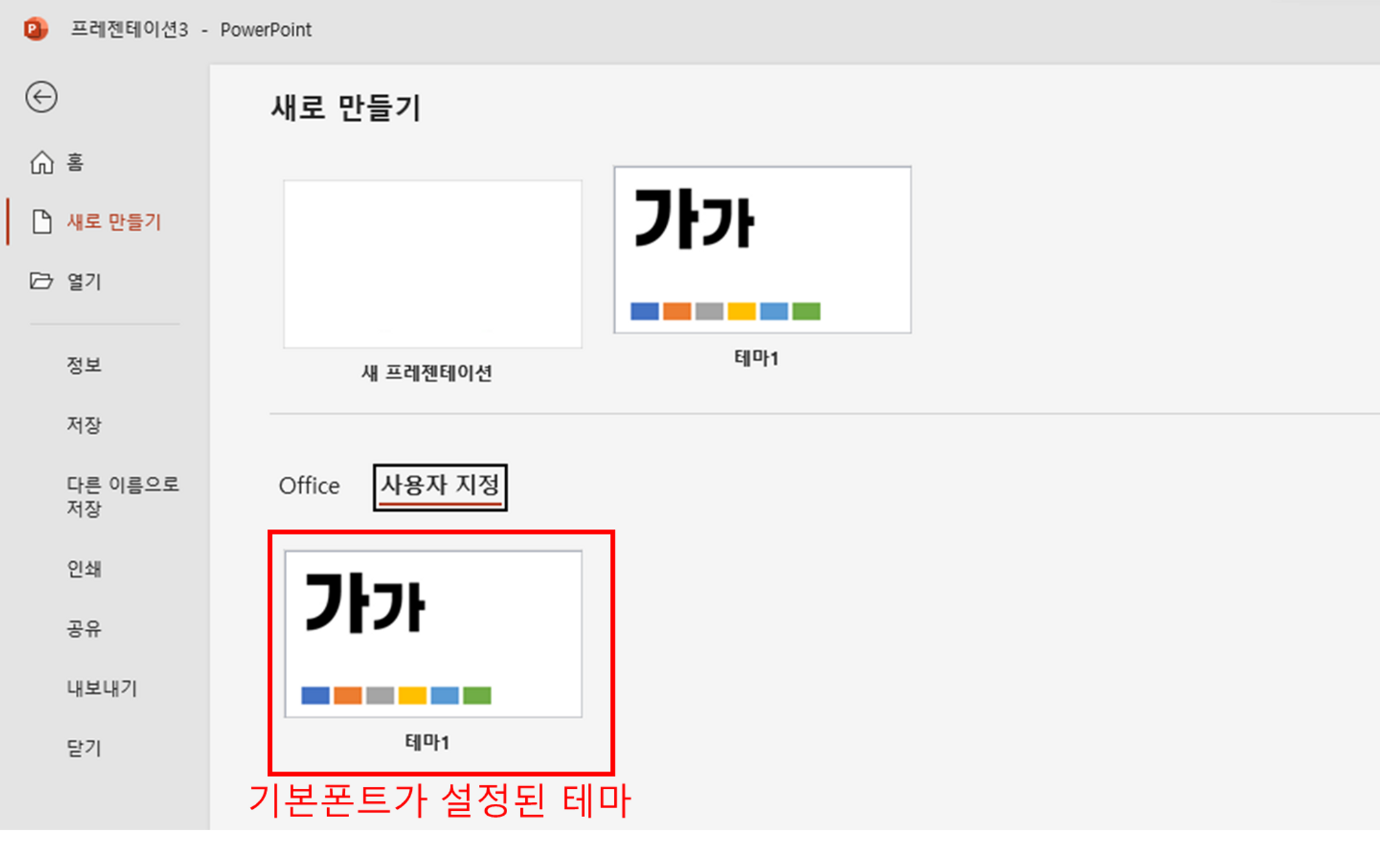 시스템 기본 폰트를 변경해볼까 생각했지만, 파워포인트가 아닌 곳에서도 영향을 받아서 다른 방법을 찾기 시작했습니다. 그러다가 찾은 방법이 파워포인트 테마입니다.