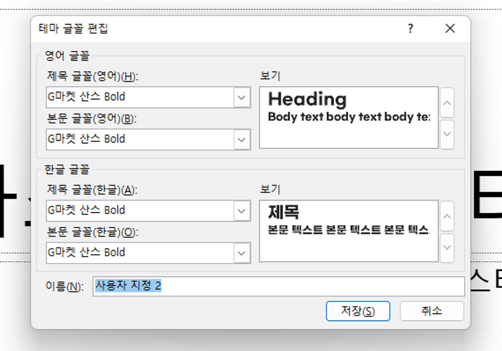 시스템 기본 폰트를 변경해볼까 생각했지만, 파워포인트가 아닌 곳에서도 영향을 받아서 다른 방법을 찾기 시작했습니다. 그러다가 찾은 방법이 파워포인트 테마입니다.