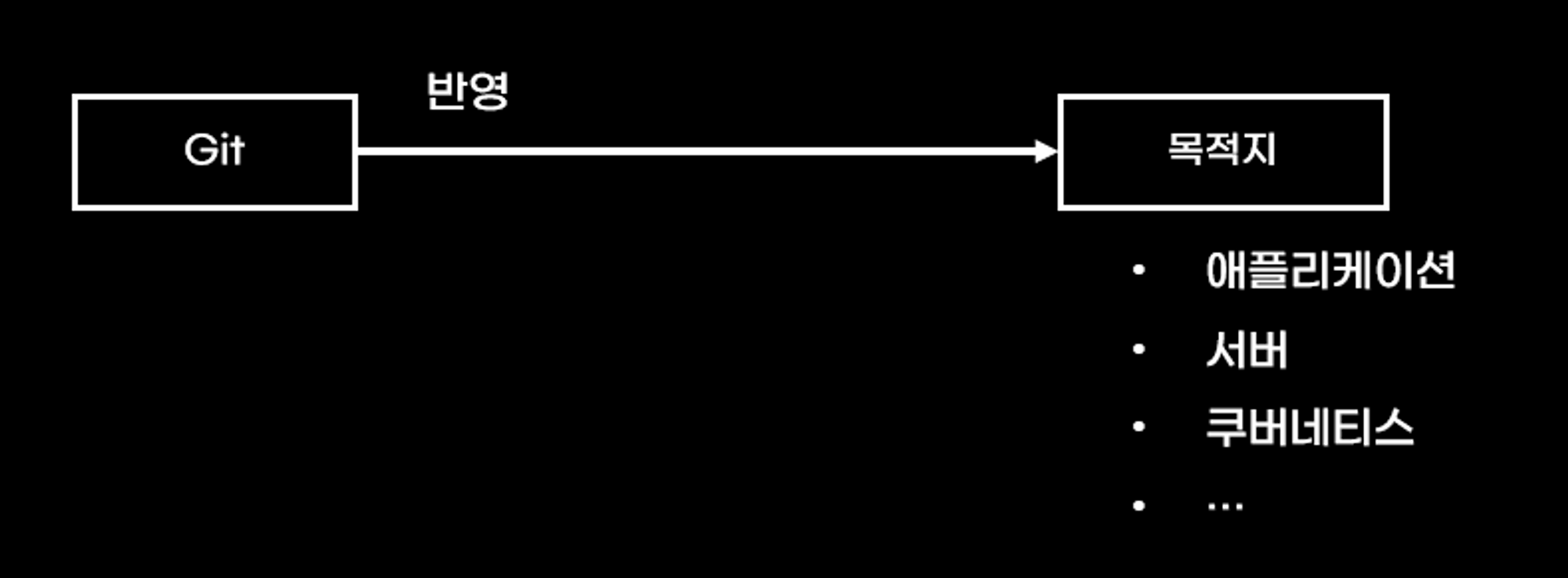 첫 번째는 git에 있는 내용을 목적지에 반영하는 것인데요. 목적지는 애플리케이션(백엔드, 프론트 등)이 될 수도 있고 서버, 플랫폼 등이 될 수 있습니다. 사용자는 목적지에 반영할 내용을 먼저 git에 저장한 후 목적지에 반영해야 합니다.