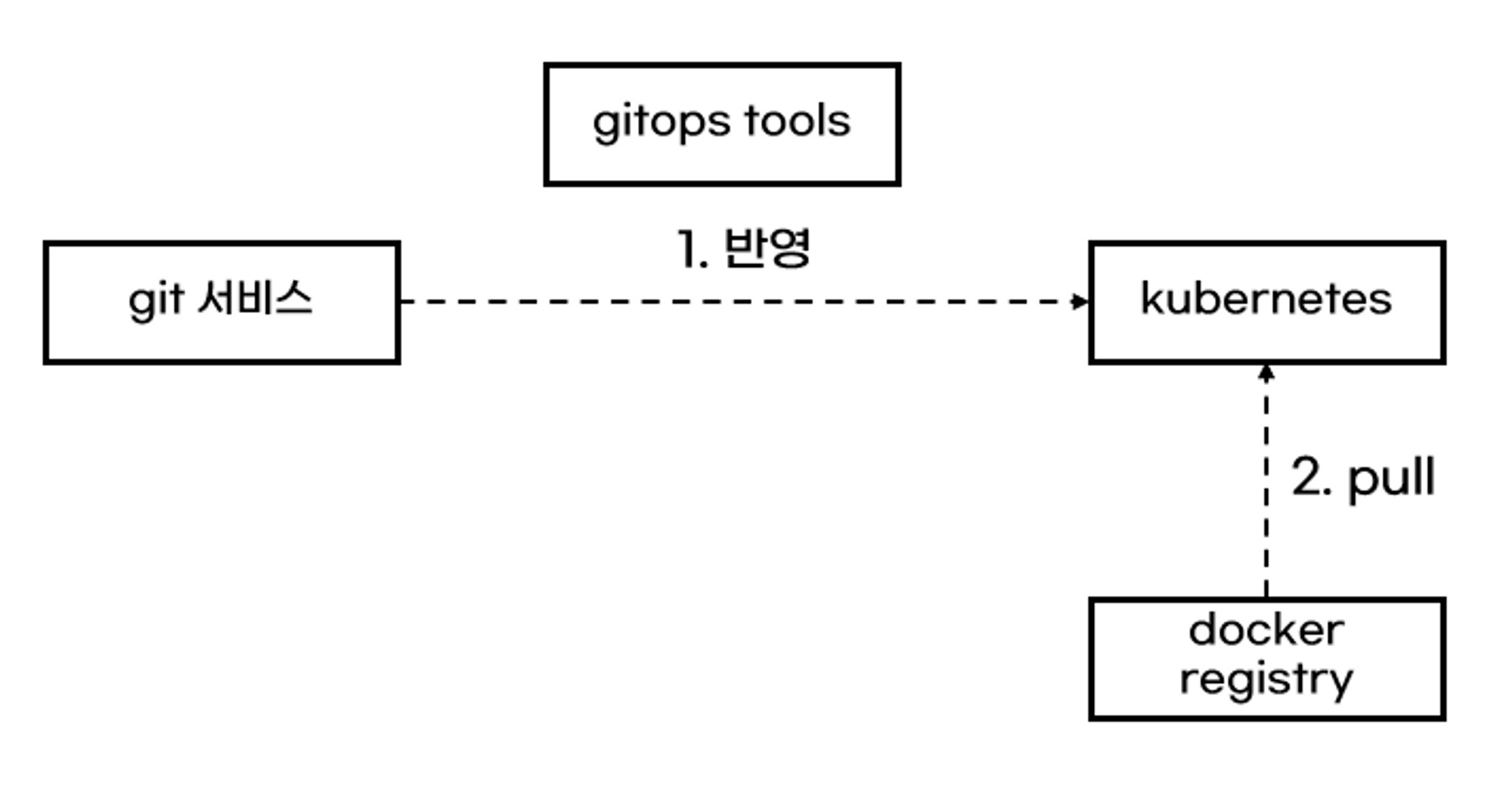 사용자 입장에서는 2가지 작업(git 저장, 쿠버네티스에도 반영)을 해야합니다. 이 단계를 편리하게 할 수 있도록 도와주는 도구가 쿠버네티스 gitops도구입니다. 대표적으로 argo cd, flux cd가 있습니다.