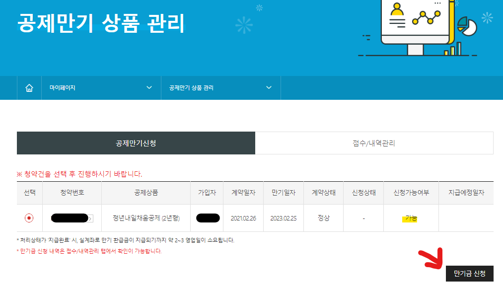 3. 신청가능여부가 가능인지 확인합니다. 그리고 오른쪽 아래 "만기금 신청"버튼을 클릭합니다.